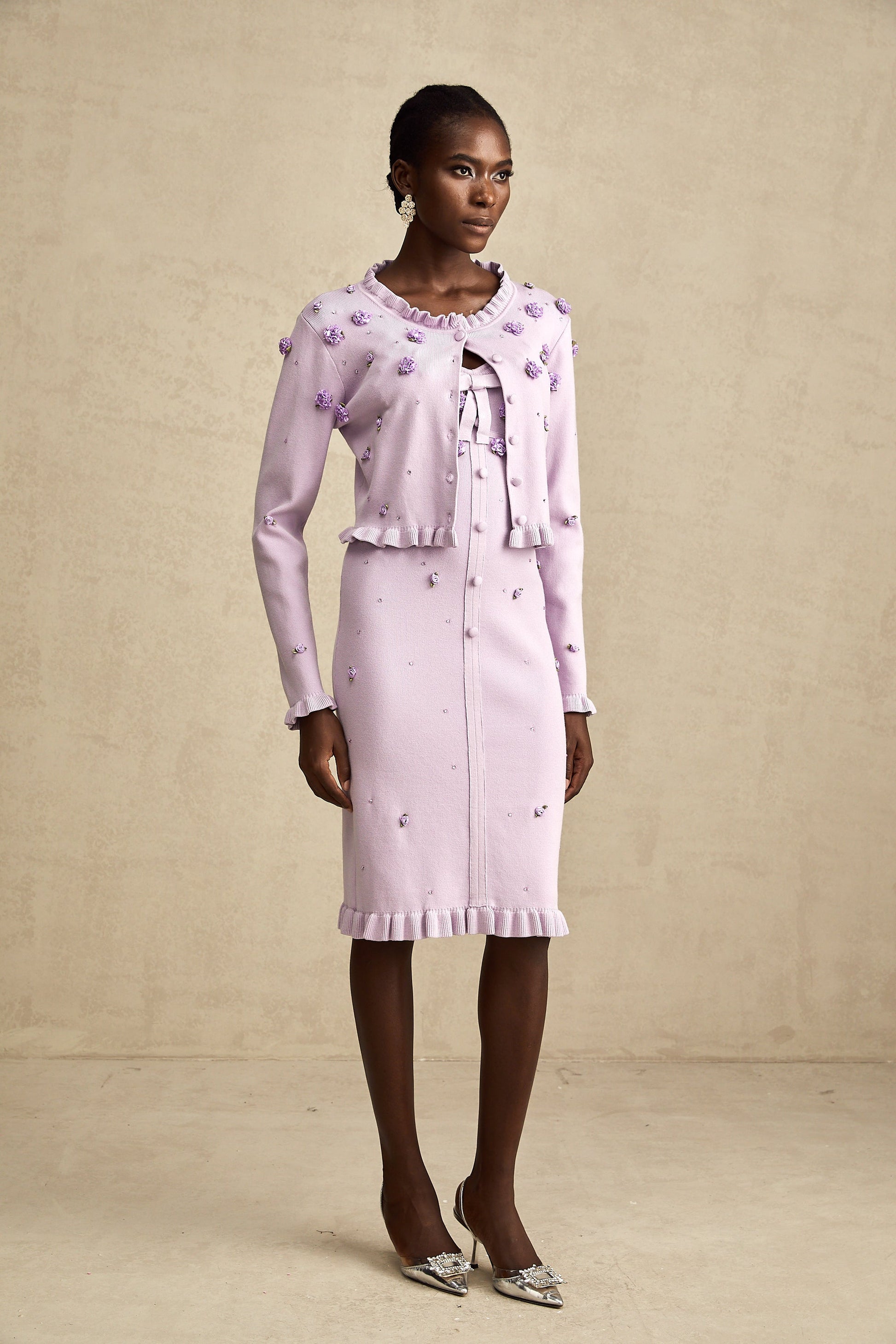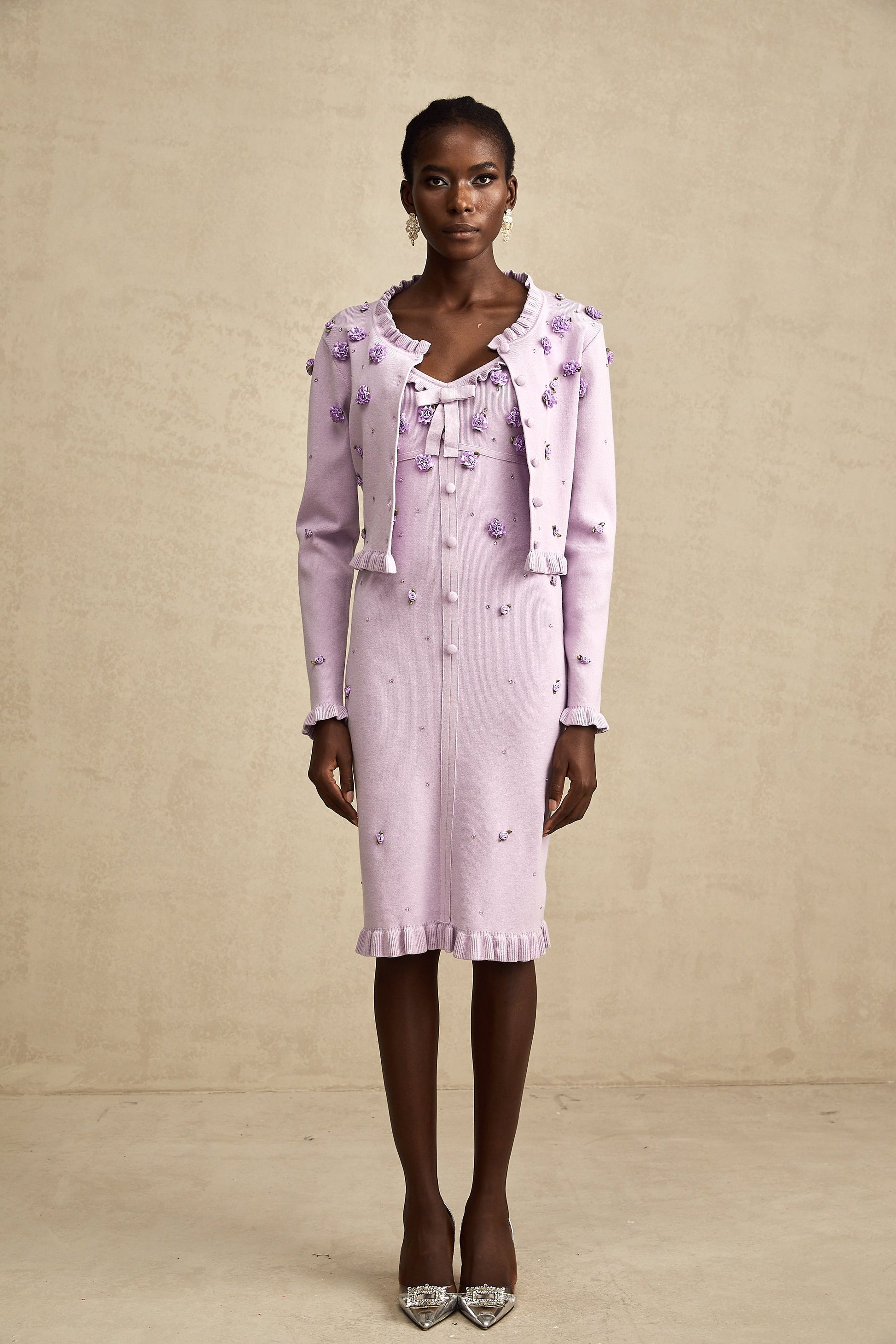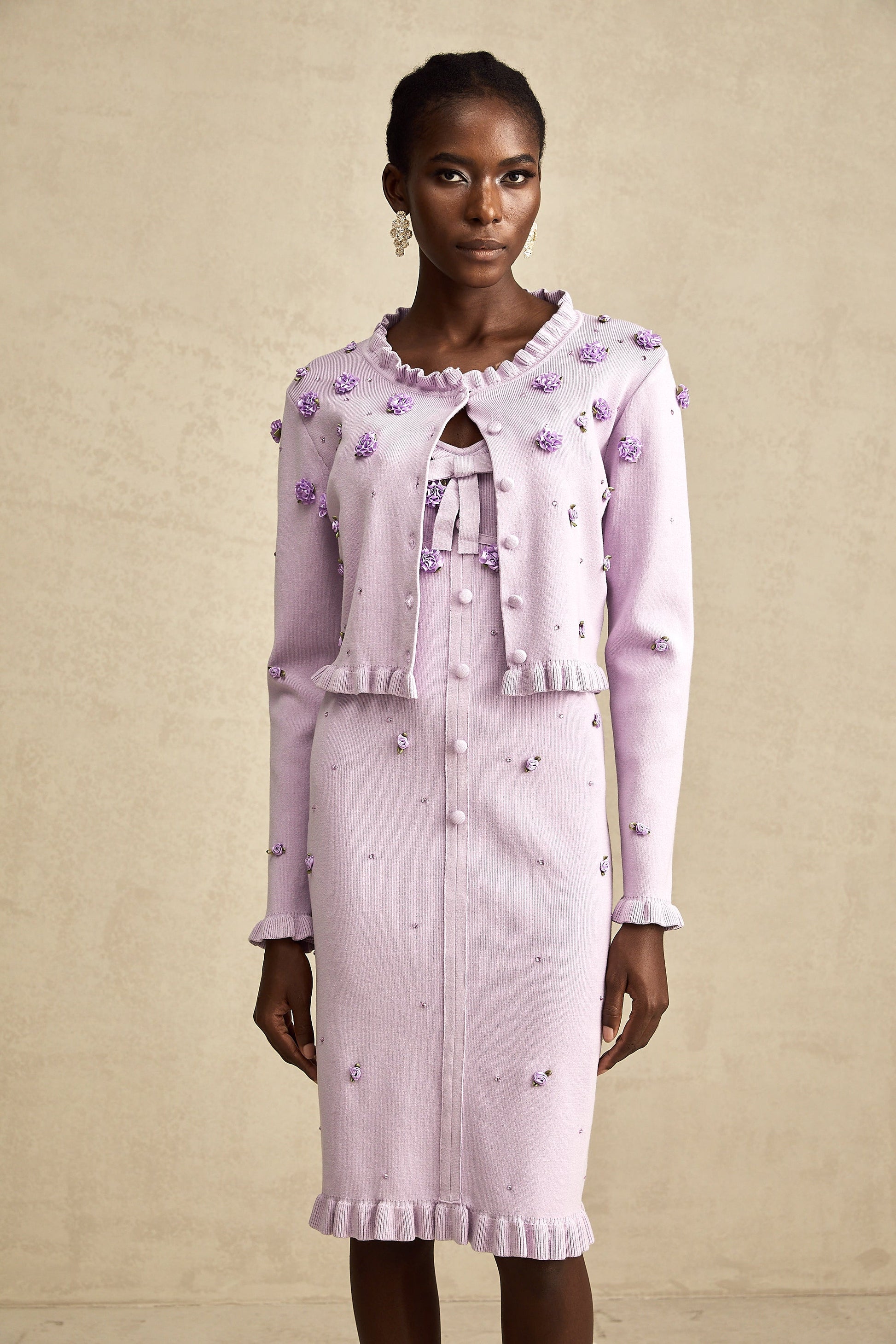 Estelle purple faux-flower knitted cardigan & dress matching set
