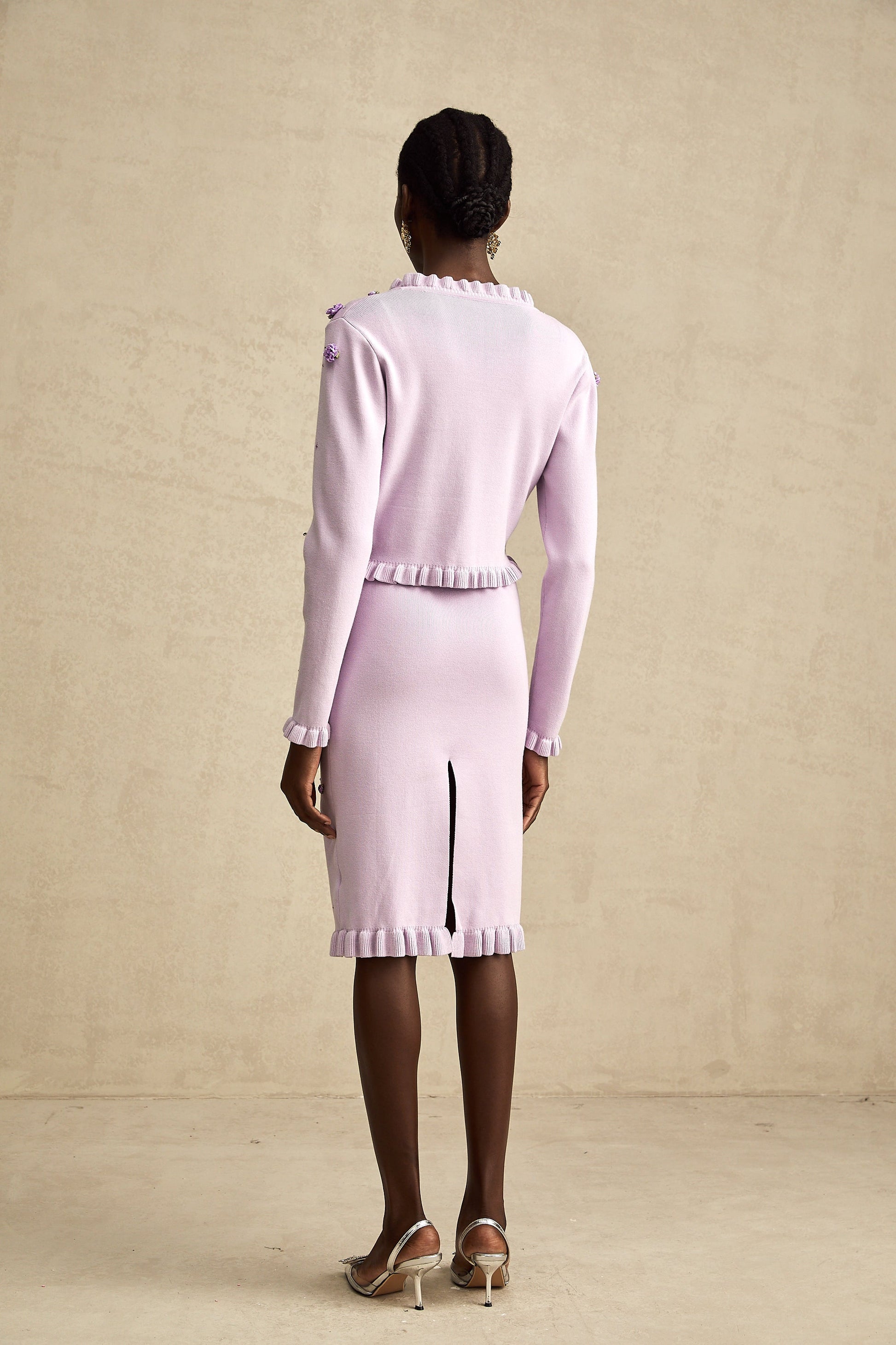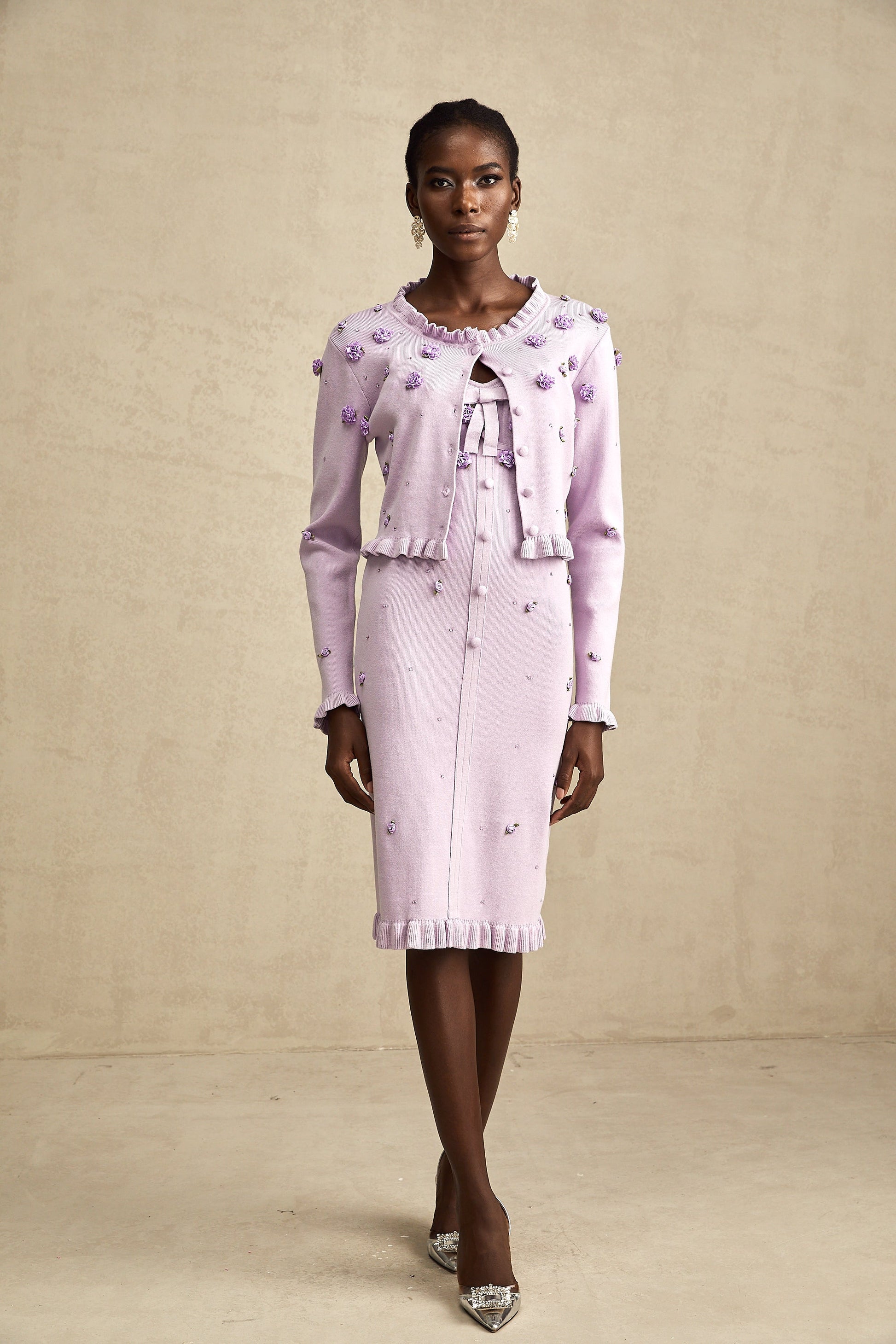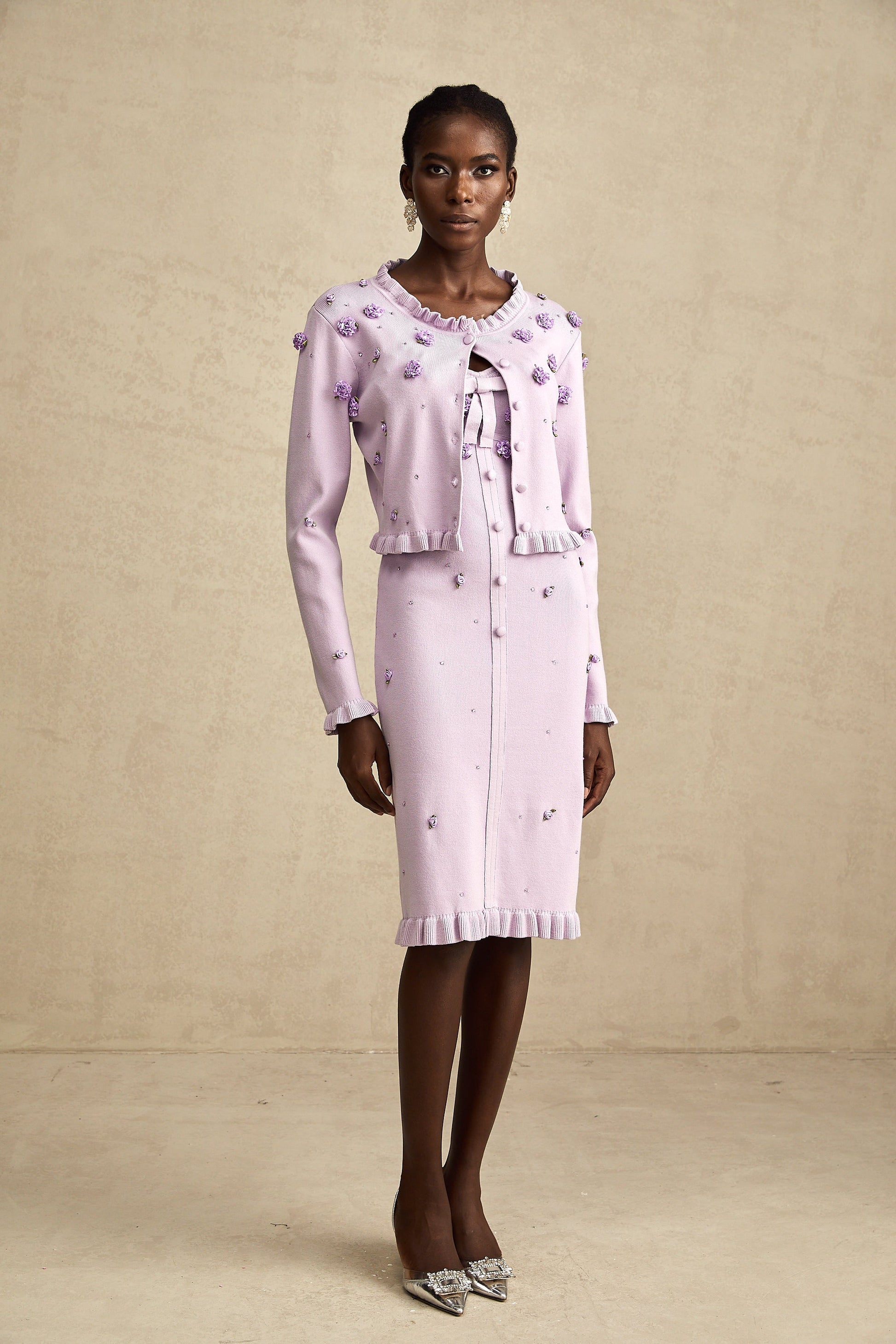 Estelle purple faux-flower knitted cardigan & dress matching set