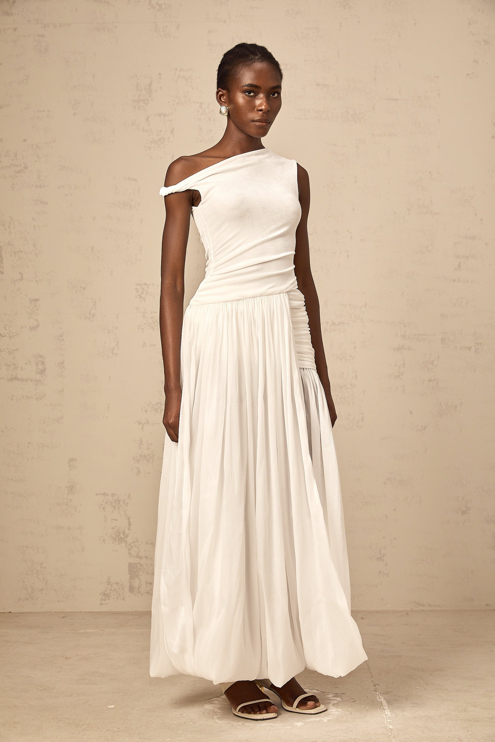 Eugenie white mono-shoulder shirred-panel maxi dress