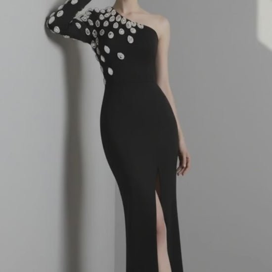 MAISON CELIE – ONE-SHOULDER CRYSTAL EMBELLISHED EVENING GOWN