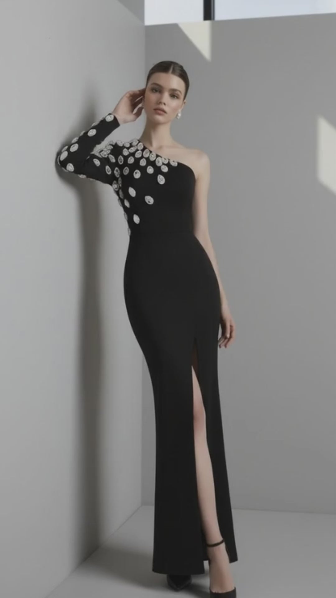 • Dramatic crystal-embellished sleeve creating a sculptural couture effect