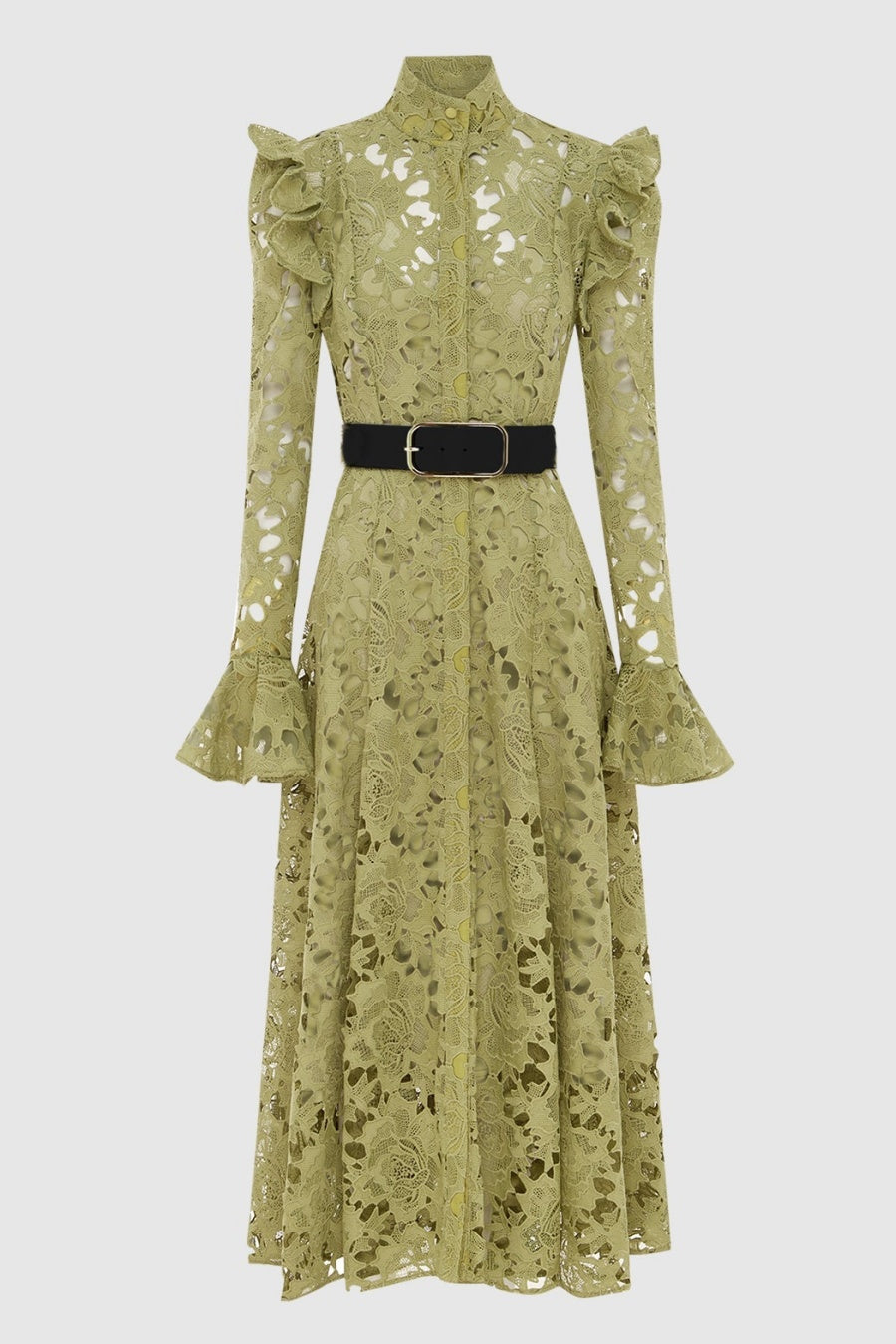 Freya Ruffle Lace-embroidered Belted Midi Dress - Green