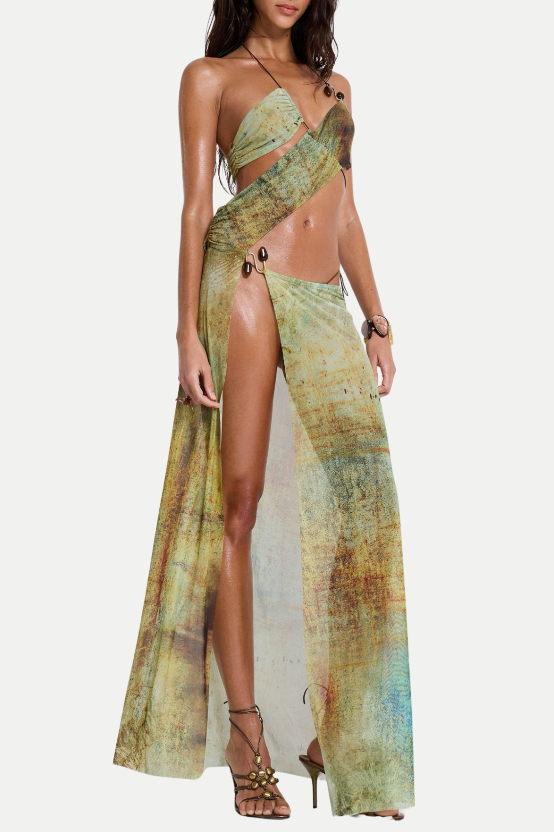 Introducing the Himer Print Mesh Embellished Slit Maxi Dress. Featuring delicate mesh accents and intricate embellishments, this dress exudes sophistication and luxury. The flowing maxi silhouette and daring slit add an element of drama, making it the perfect choice for any special occasion. Elevate your style with this stunning dress.