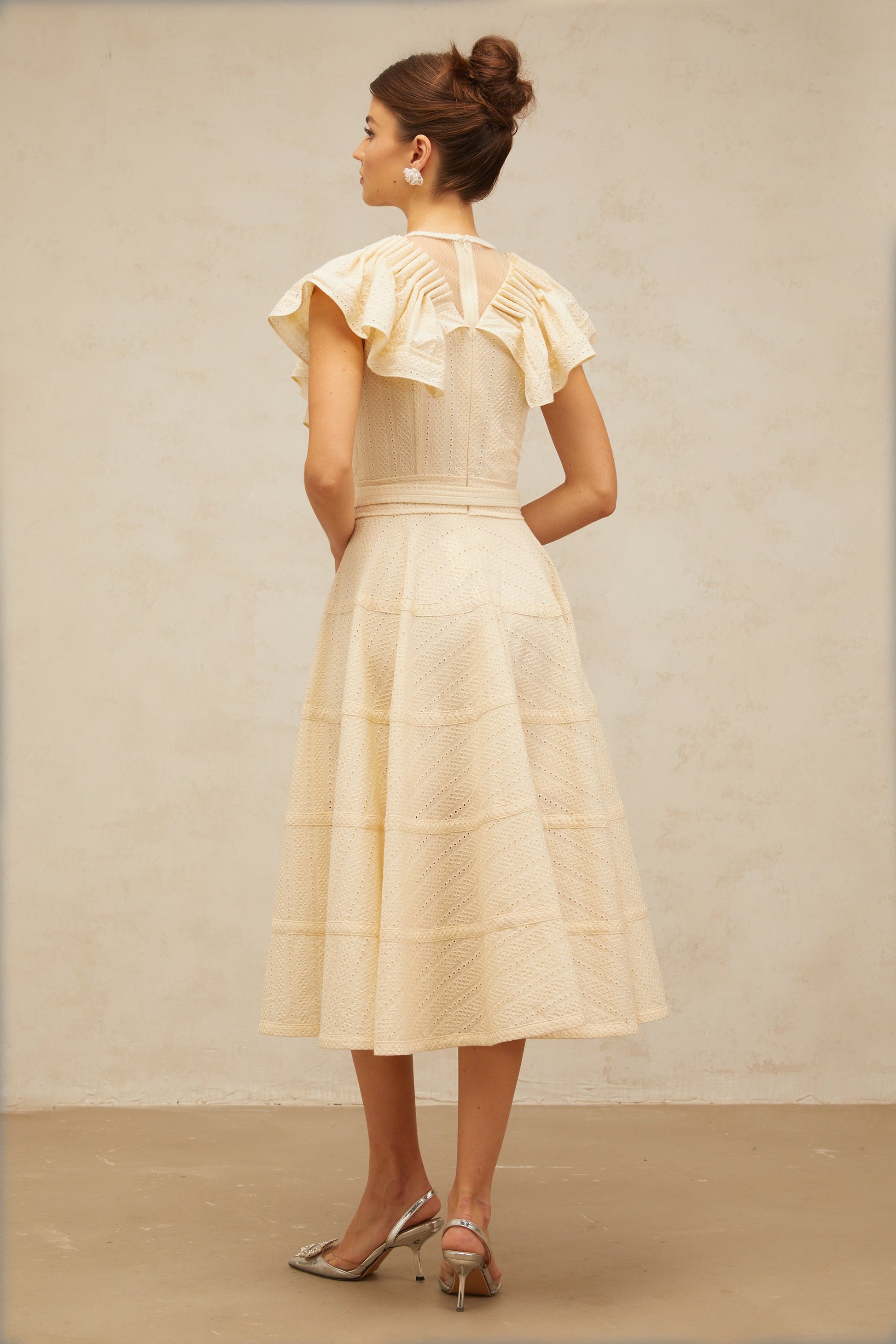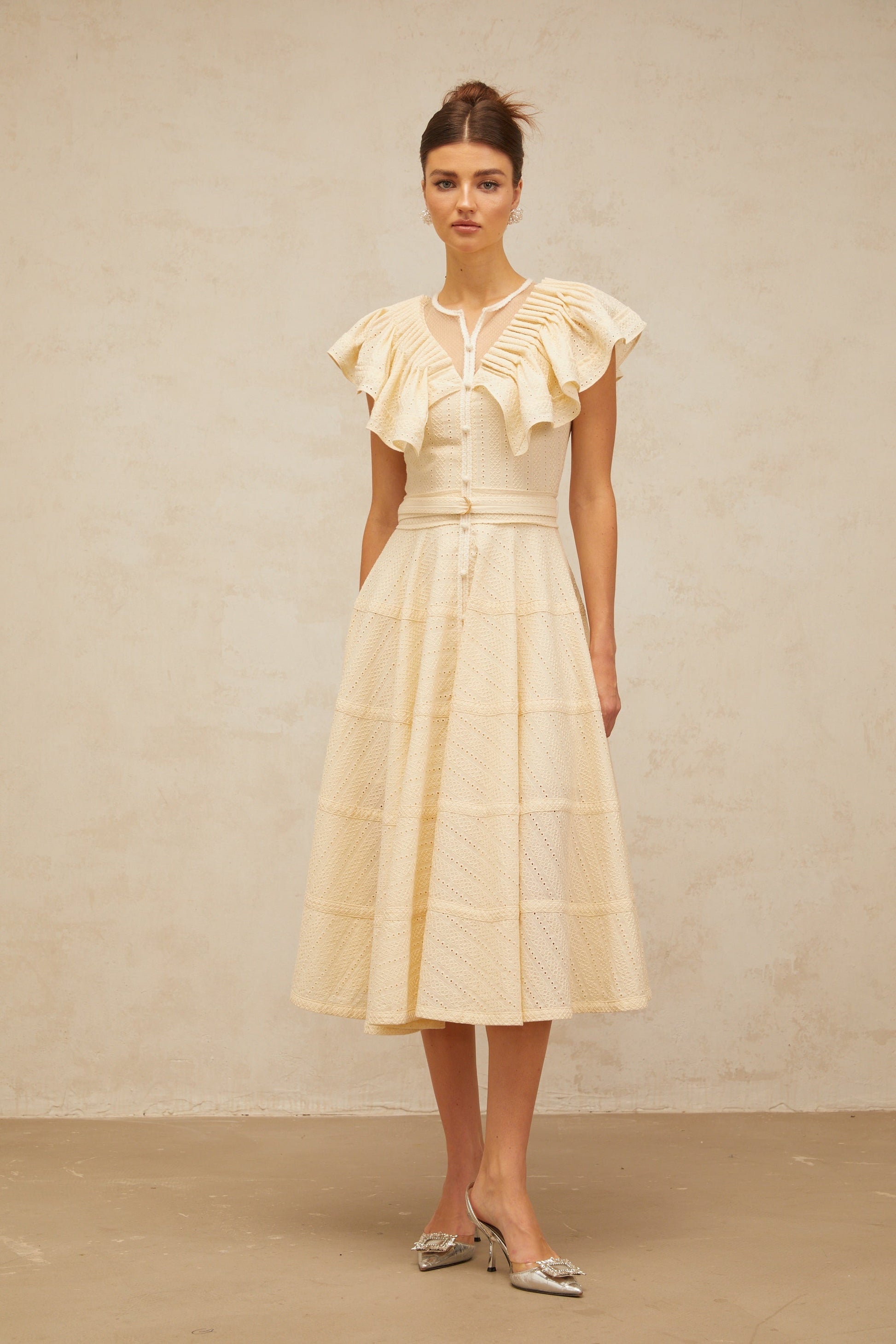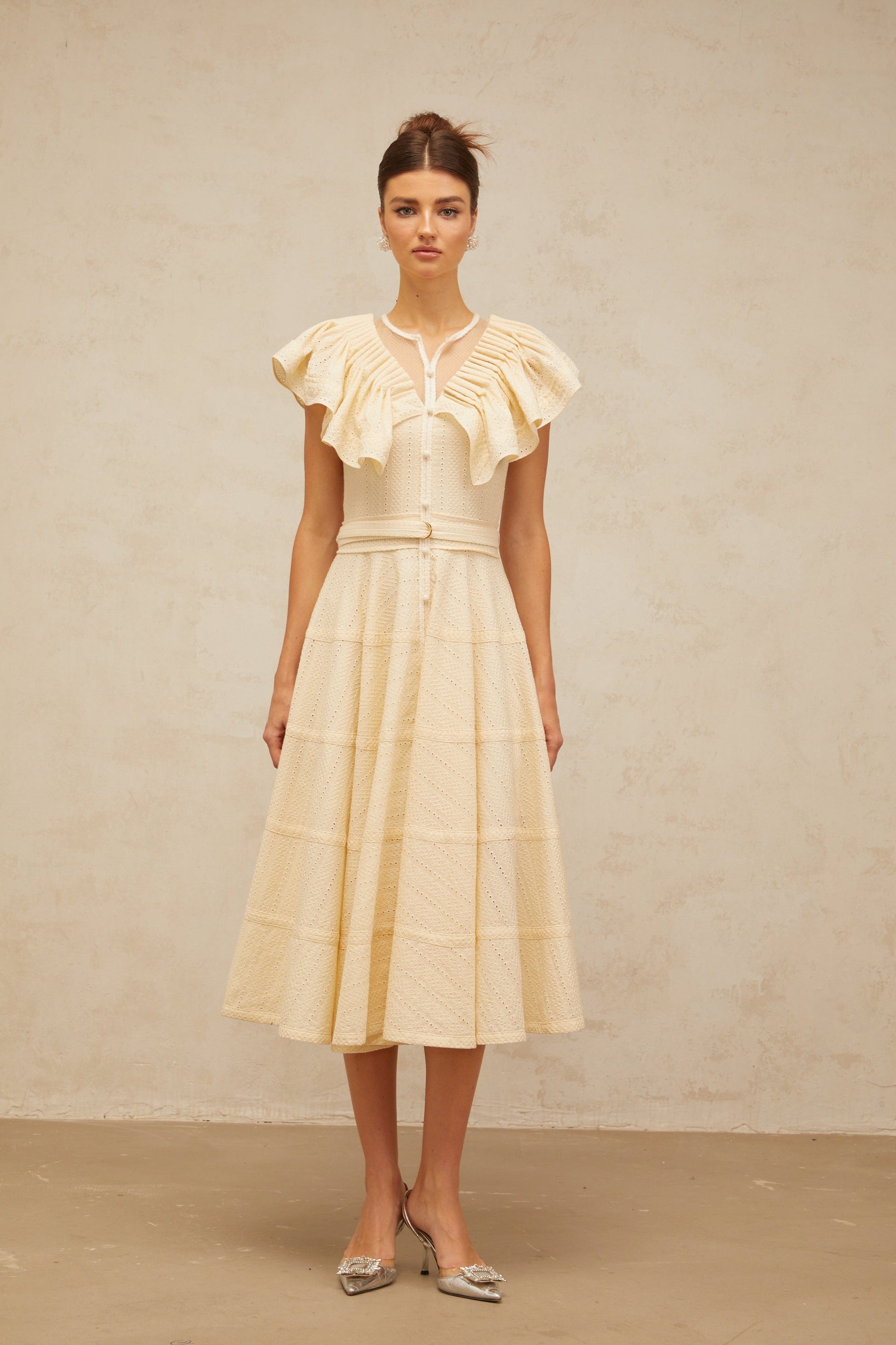 Irène neutrals belted pointelle-trim ruffled midi dress