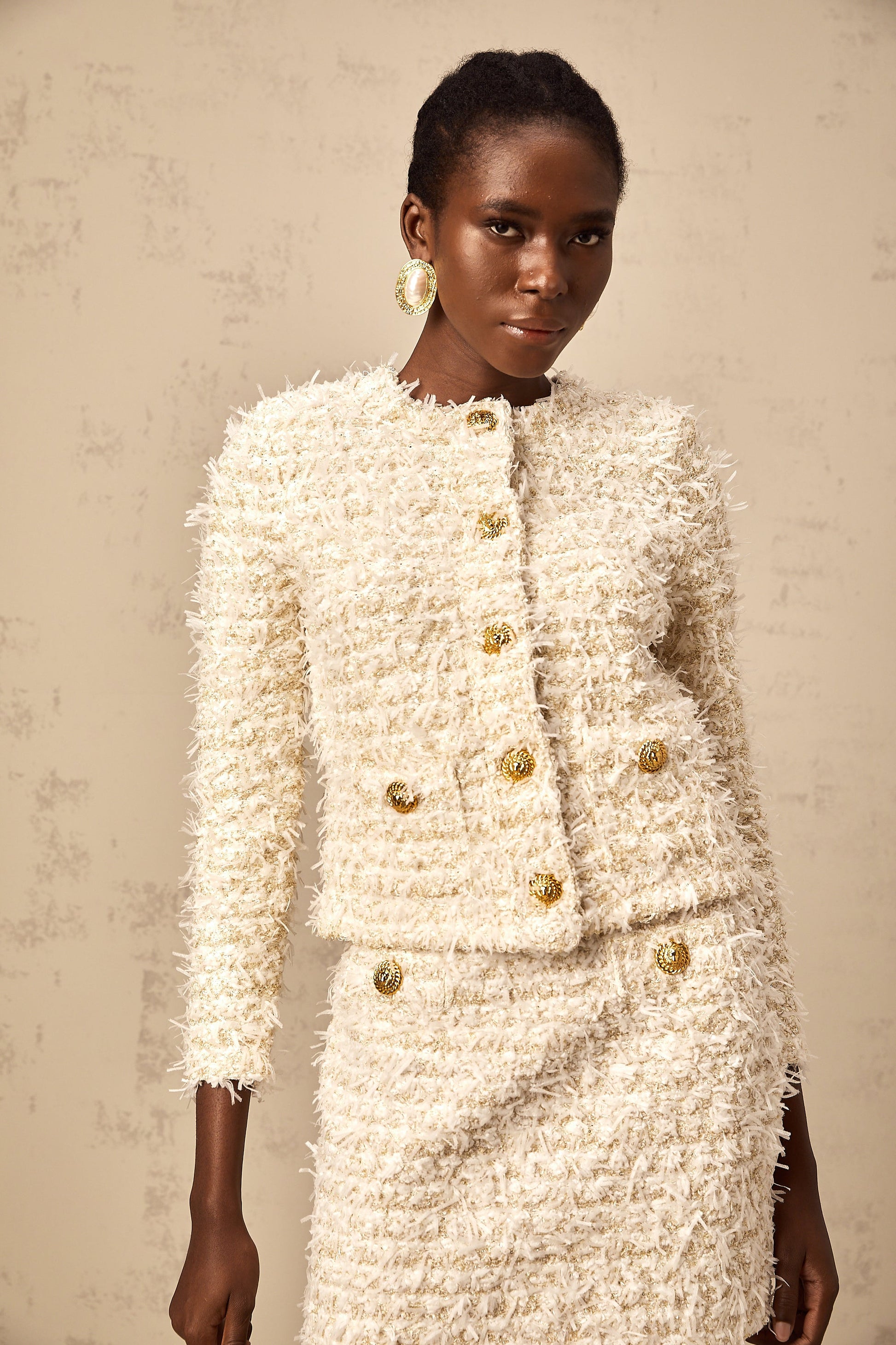 Jolanda white furry knit cardigan & skirt matching set