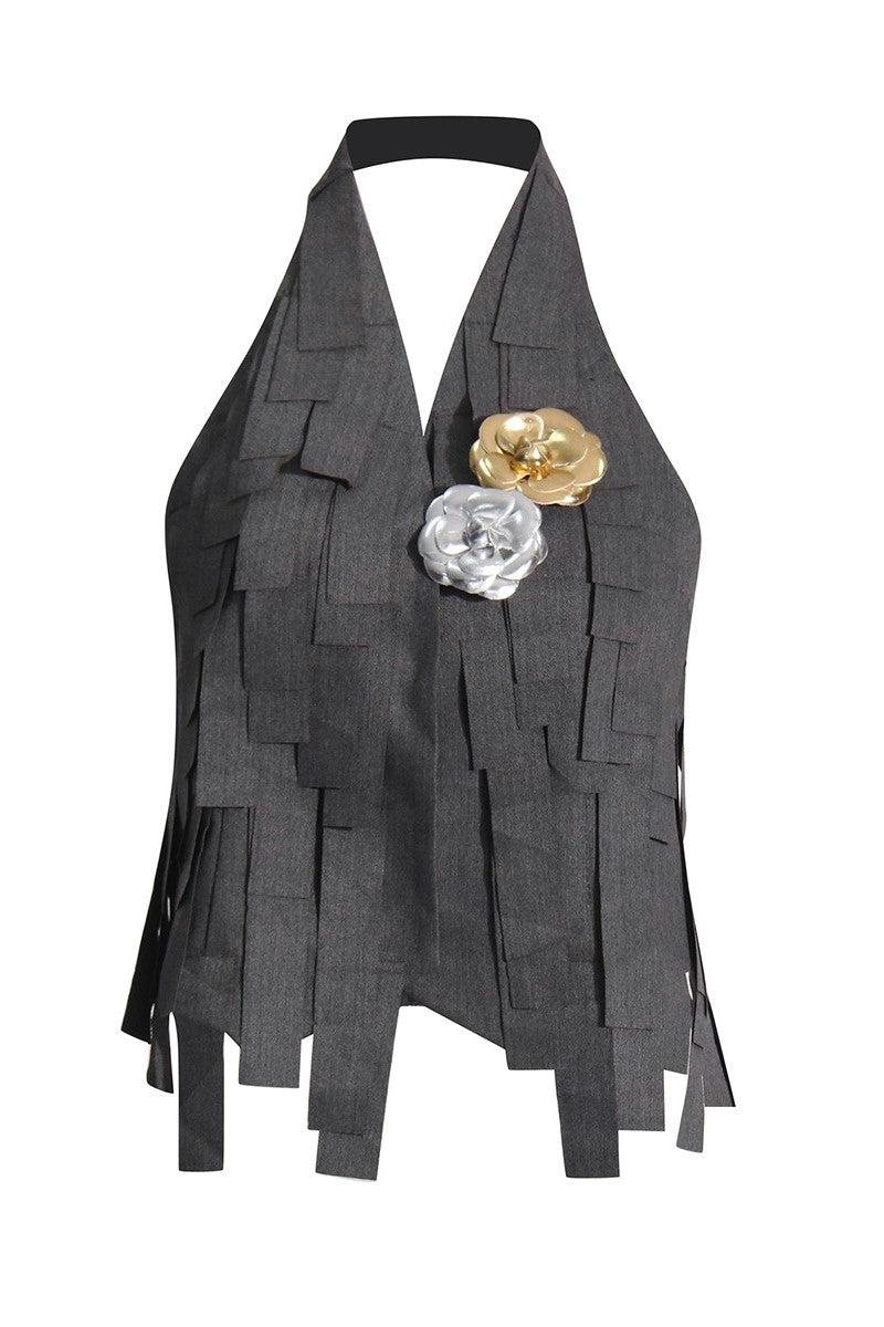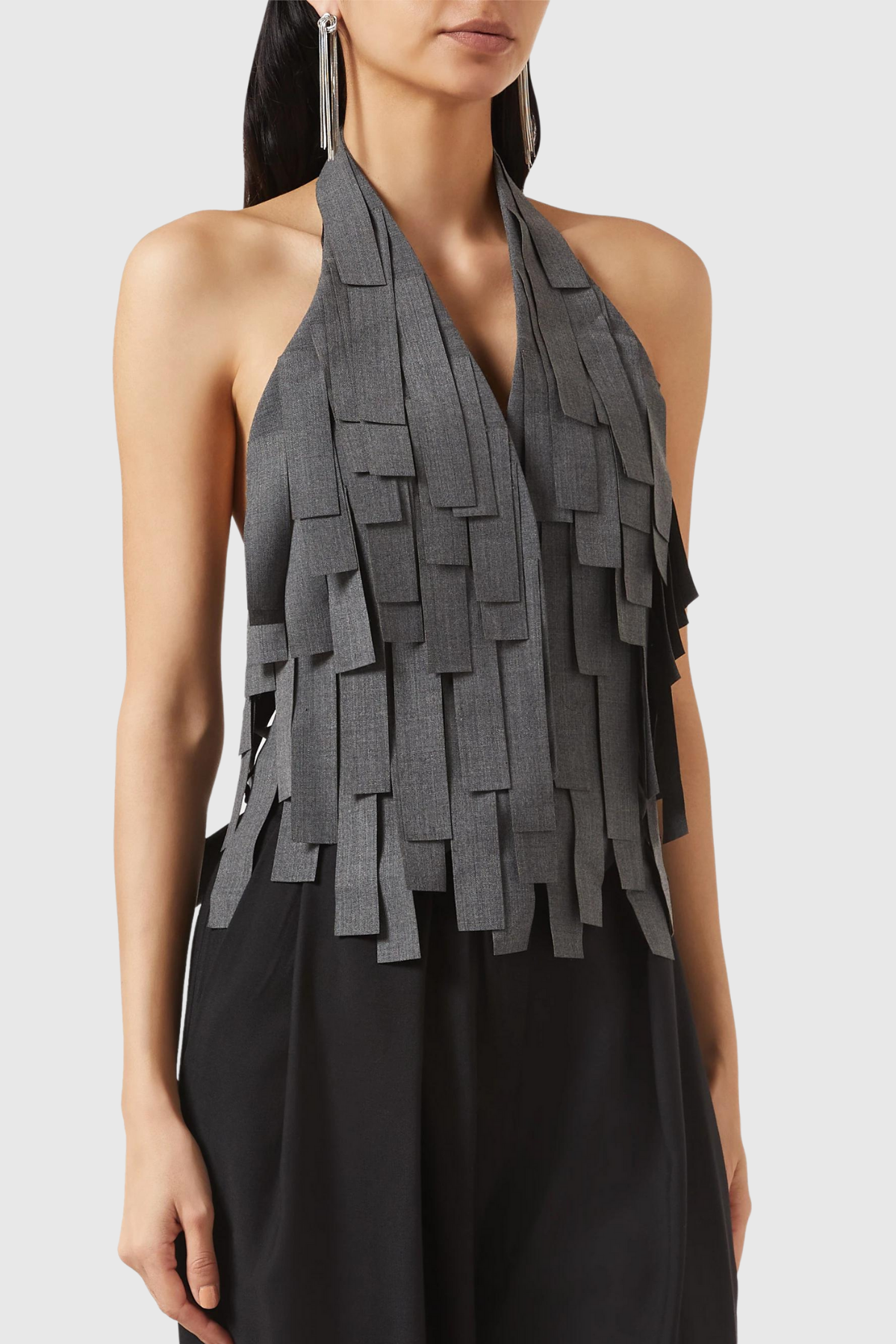 This luxurious Kelsey Fringe Halter Top offers a sophisticated and exclusive look. The intricate fringe detailing adds a touch of elegance, while the halter neckline accentuates the neckline and showcases the shoulders. Perfect for adding a touch of glamour to any ensemble.