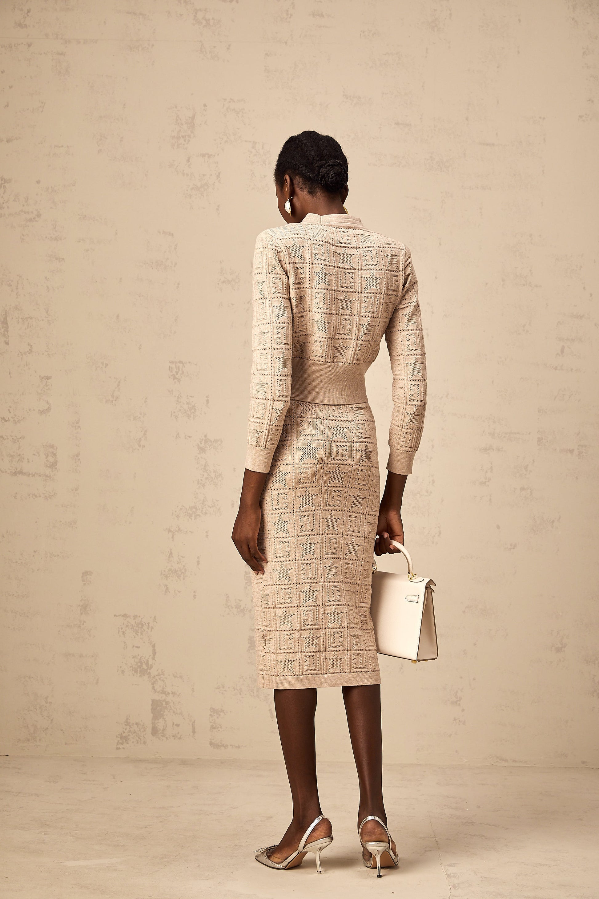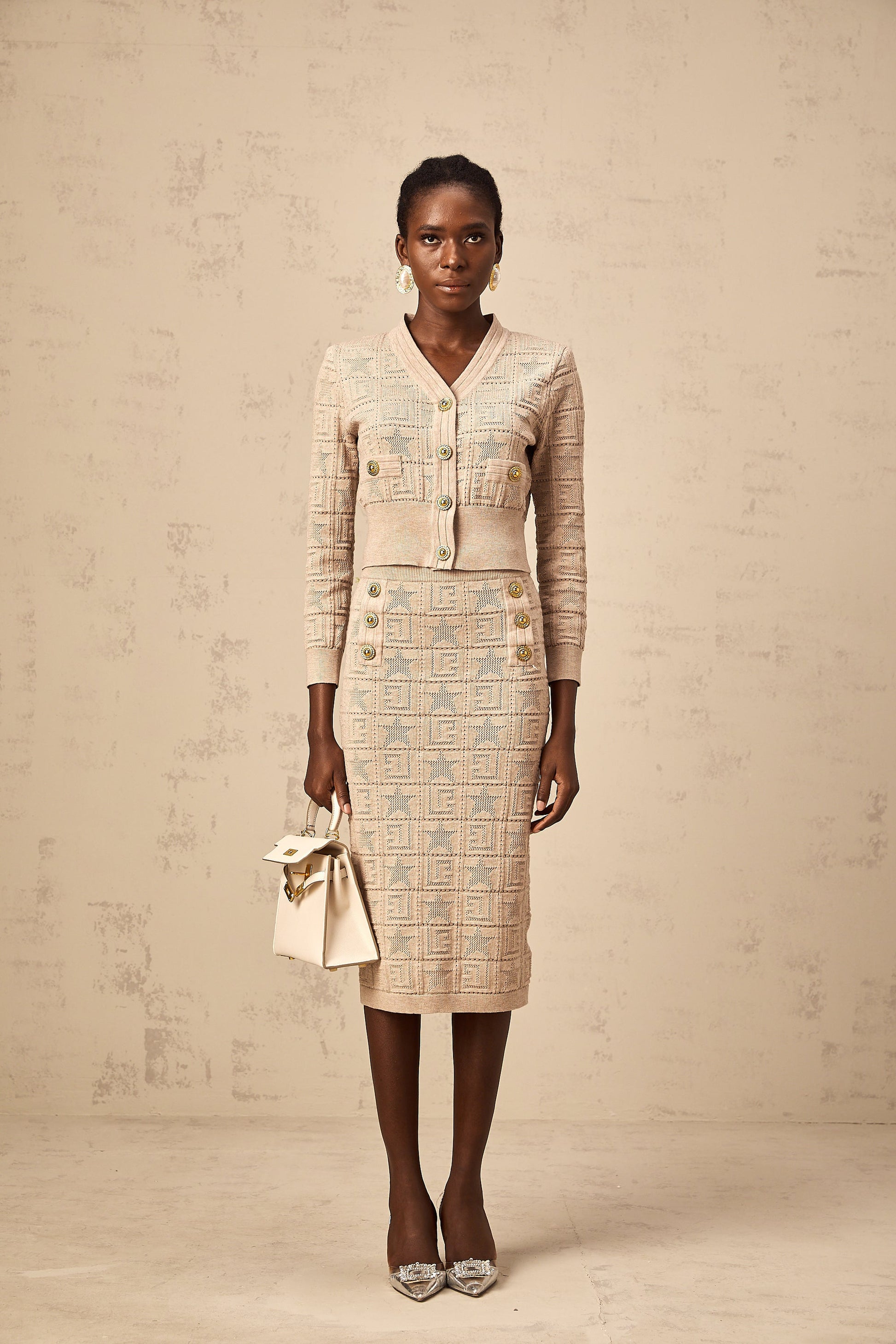 Leonie khaki star-motif crochet knit cardigan & skirt matching set