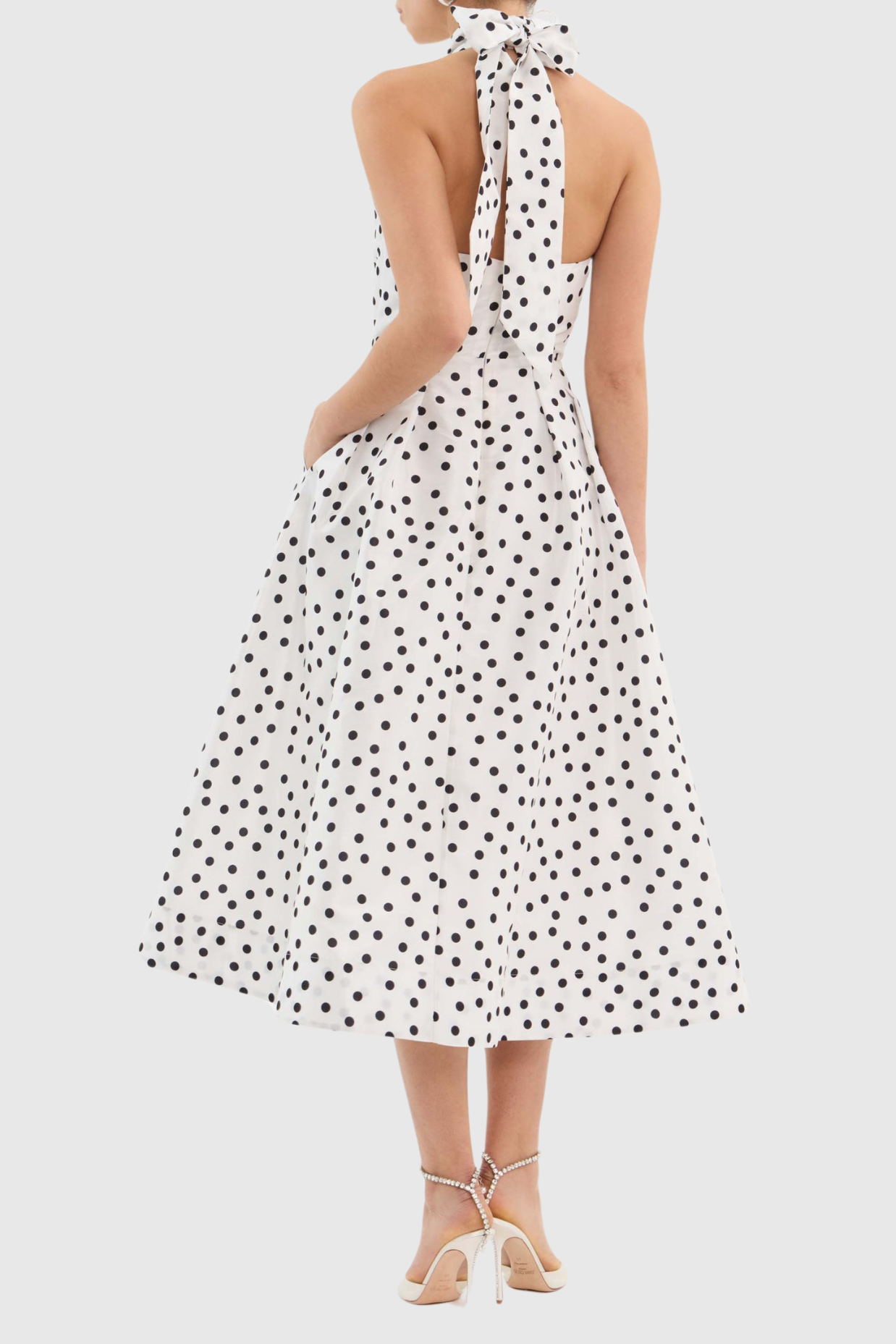 Elevate your wardrobe with our Londa Halter Polka Dot Bow Cutout Midi Dress. This refined silhouette features a graceful halter neckline complemented by a charming bow detail and strategic cutouts that create visual intrigue. The classic polka dot pattern offers timeless appeal while the midi length ensures versatility for both daytime engagements and evening soirées. Crafted with meticulous attention to detail for the discerning woman who appreciates subtle elegance.