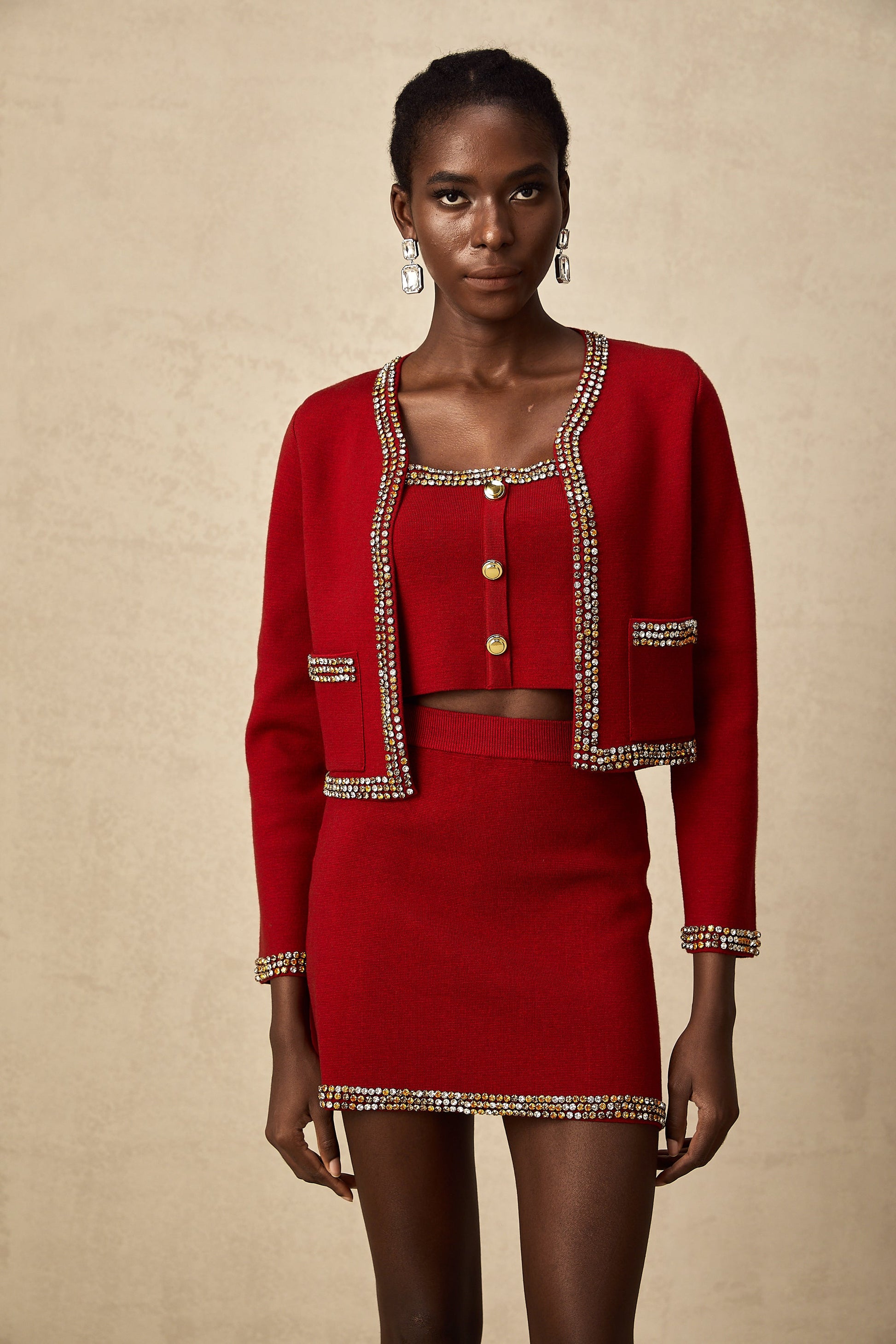 Lotus red stud knitted cardigan & vest & skirt matching set