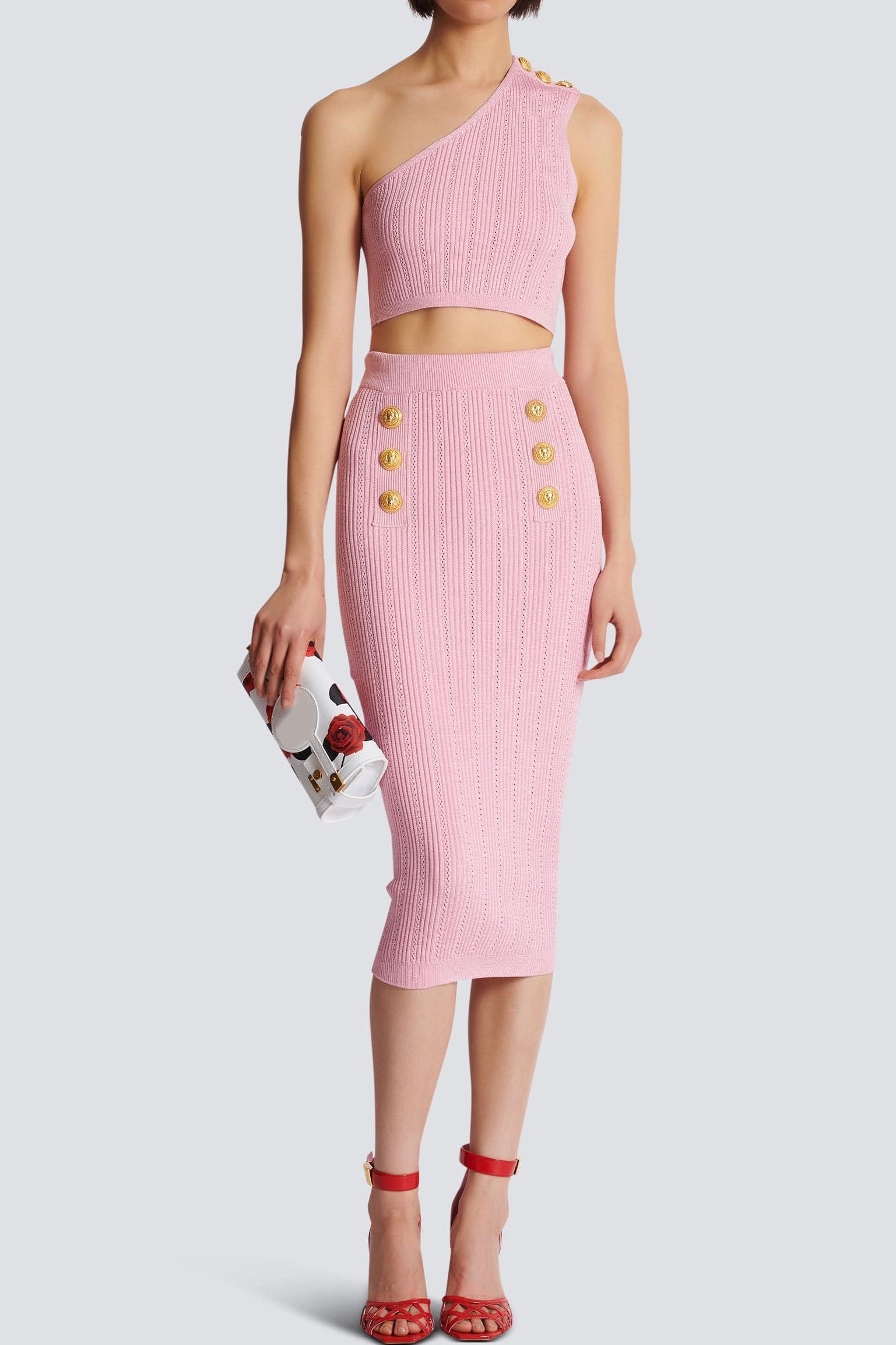 Elevate your wardrobe with the lynn One Shoulder Knit Set in delicate pink. This luxurious set features a unique one-shoulder design and beautiful button detailing. Made from premium knit fabric, it offers the perfect blend of comfort and style. Perfect for any occasion, this set is a must-have for the fashion-forward individual.