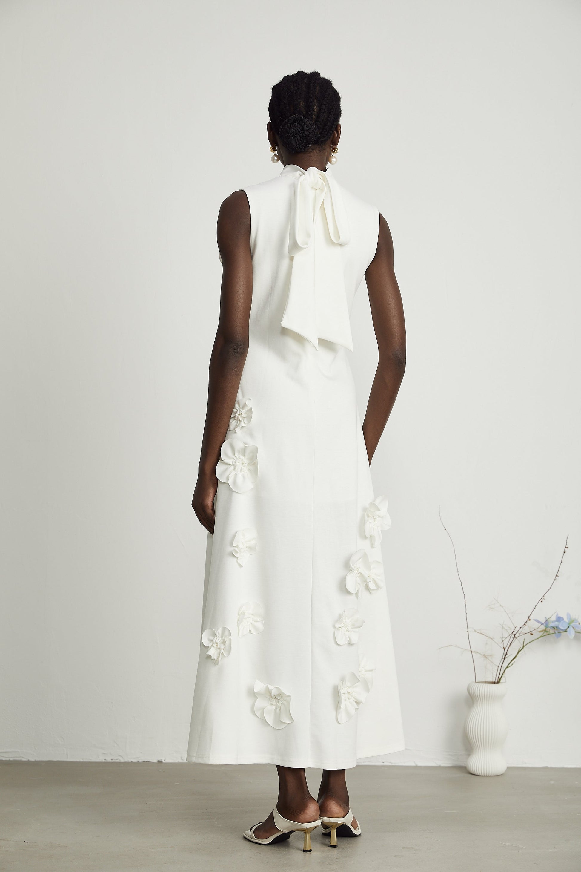 Magali bow-tie faux-flower embellished sleeveless maxi dress in White