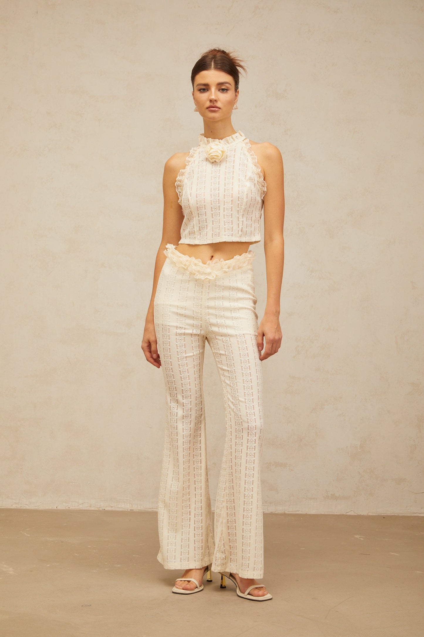 Magali cream-white ruffled-lace-trim jacquard top & trousers matching set