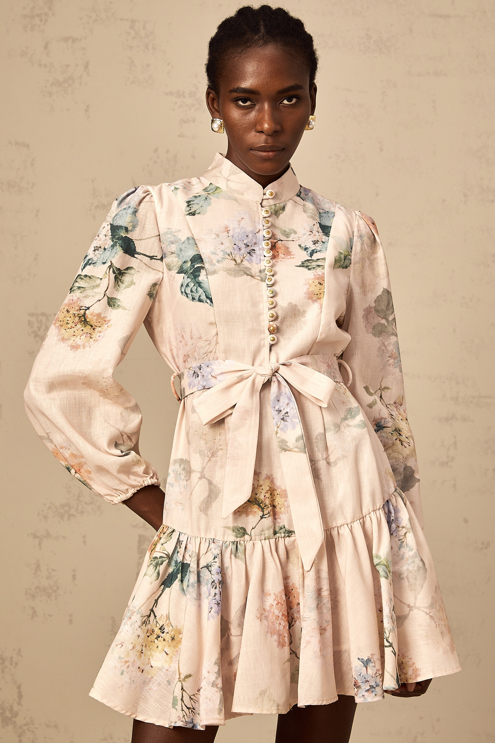 Maia tied-waist floral-print mini dress in Neutrals