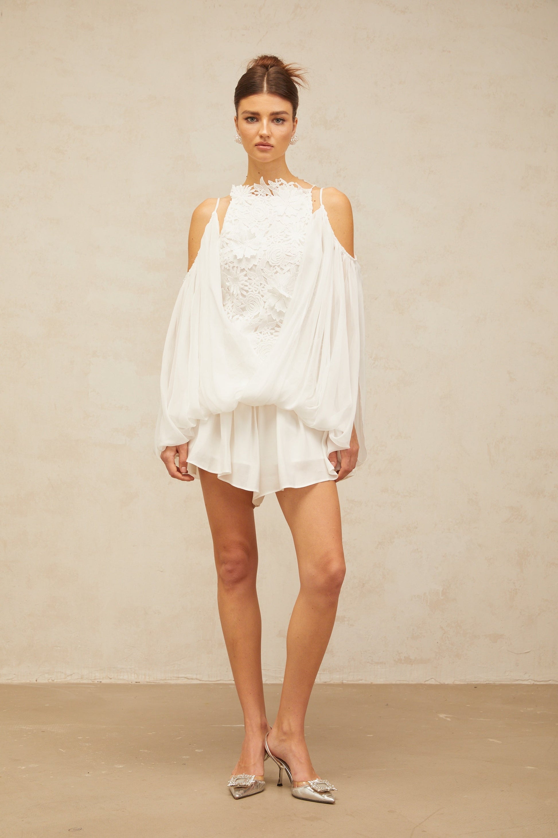 Mailys white floral-lace voile top & shorts matching set