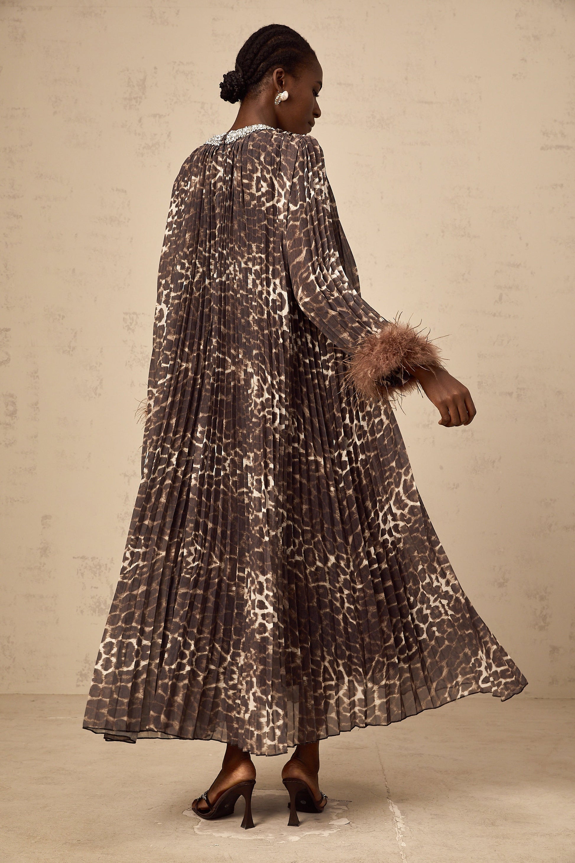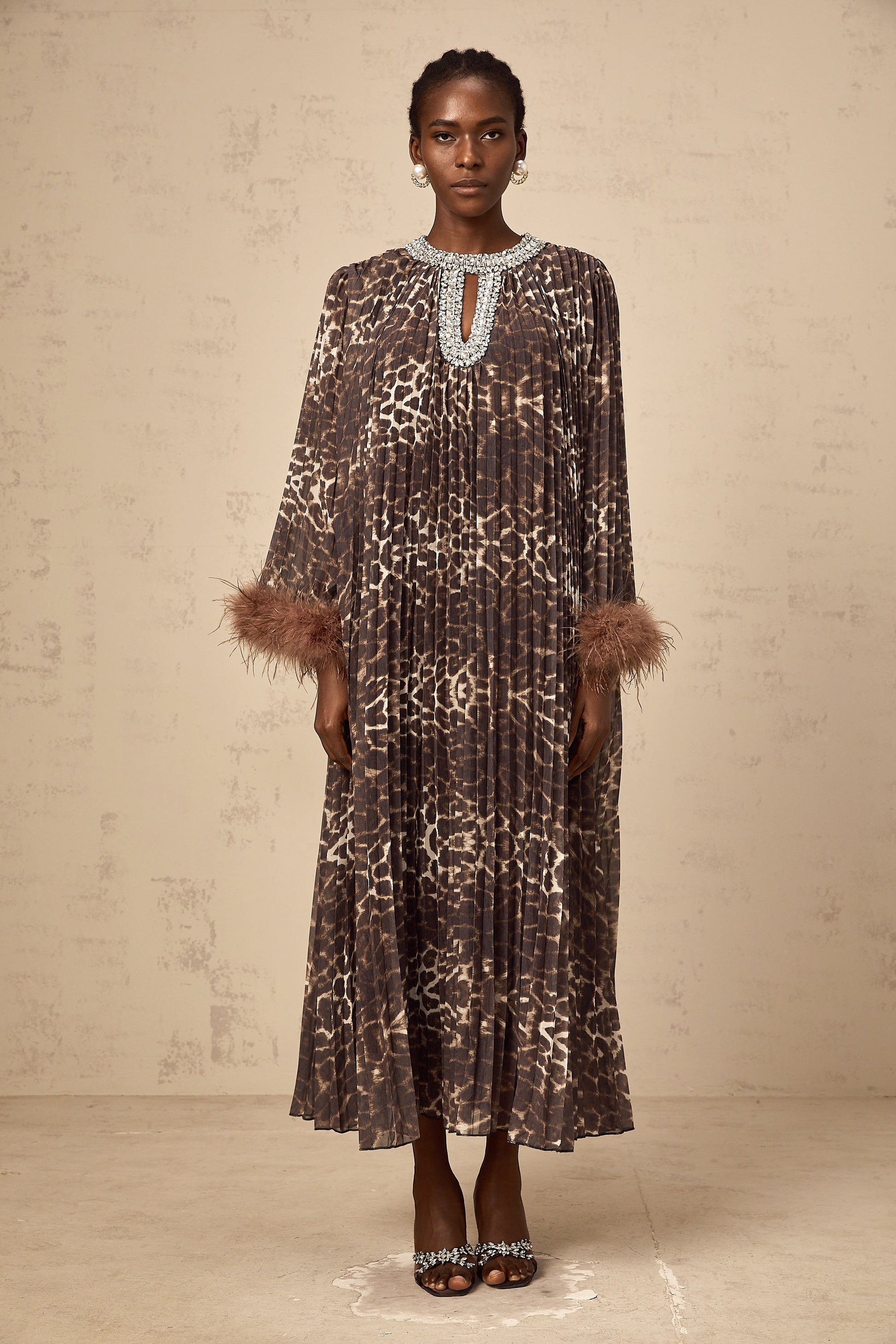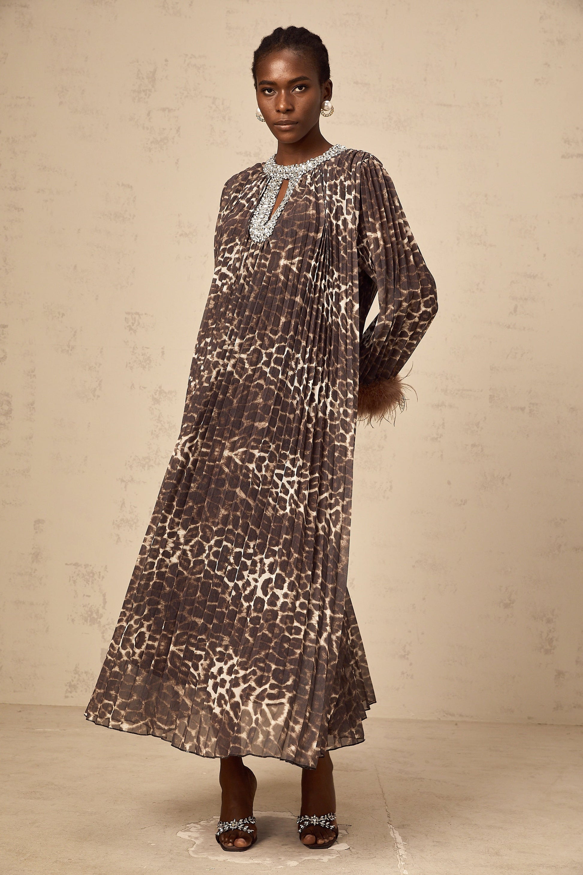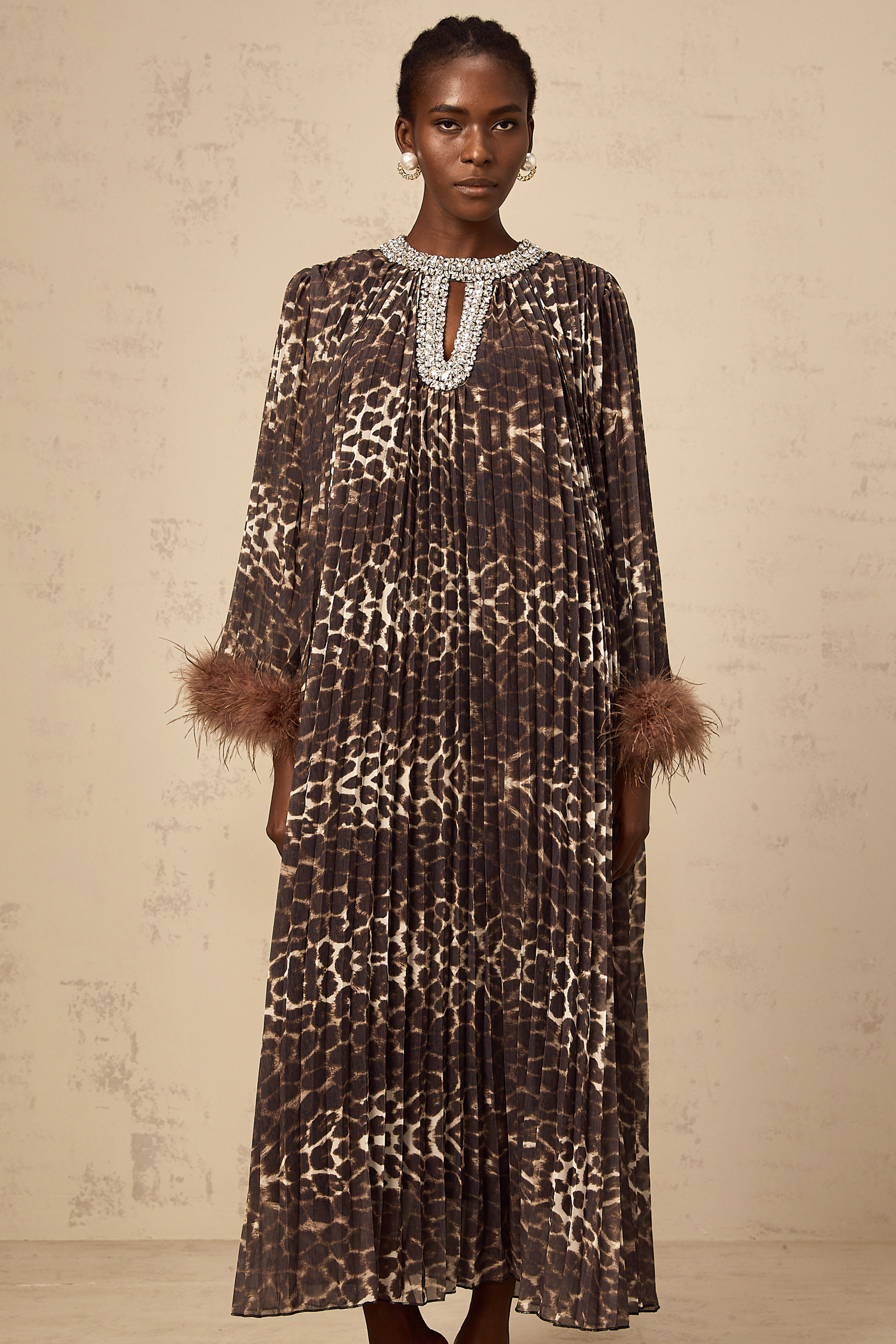 Marthe brown embellished leopard-print pleated maxi dress