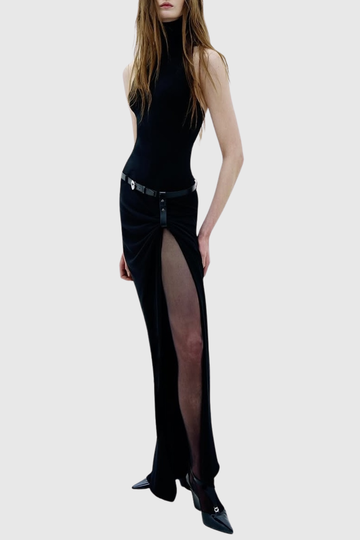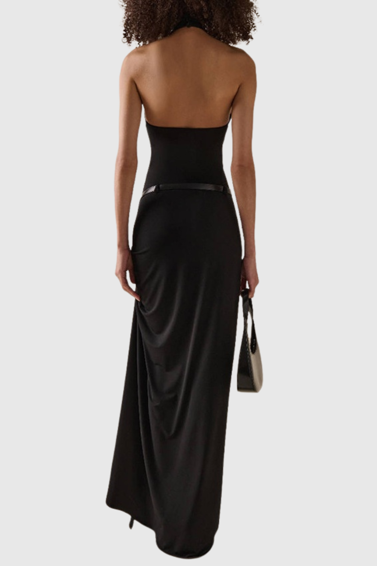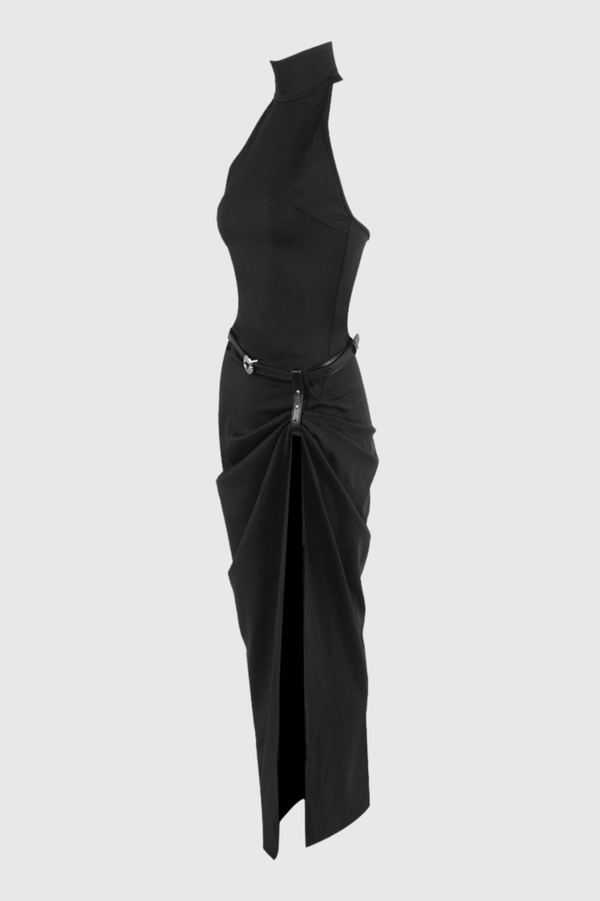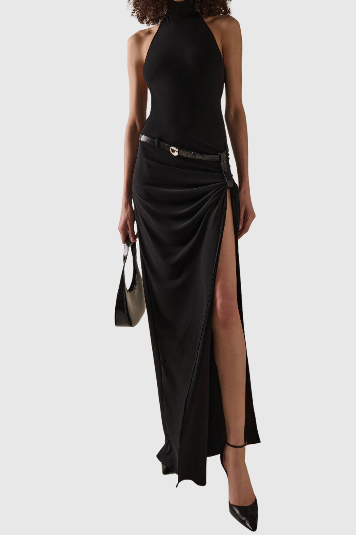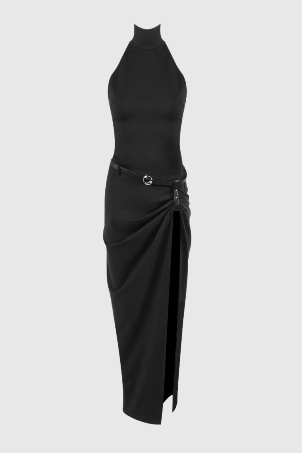 Masha Halter Ruched Belted Split Maxi Dress