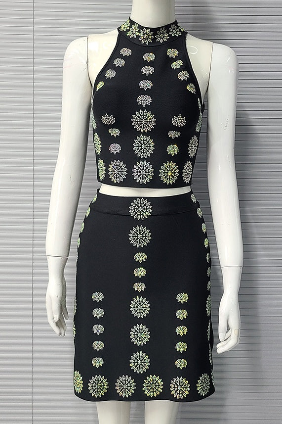 A luxurious and alluring two-piece set made from bandage, designed to make a bold and glamorous statement. The set comprises a halter-neck top paired with a matching mini skirt. The show-stopping element of this set lies in the front of the set, where the surface is covered in big crystal details. The crystals add a sense of opulence and glamour to the bandage set, turning it into a stunning piece fit for special occasions or glamorous events.