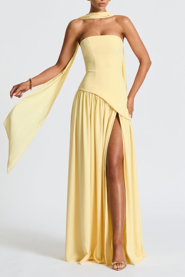 Elevate your eveningwear with the Miloni Strapless Split Maxi Dress, designed for graceful sophistication. This elegant piece features a strapless neckline that accentuates your shoulders, paired with a daring side split that adds movement and allure. Crafted to enhance your silhouette, it offers a refined look perfect for formal events or upscale occasions.