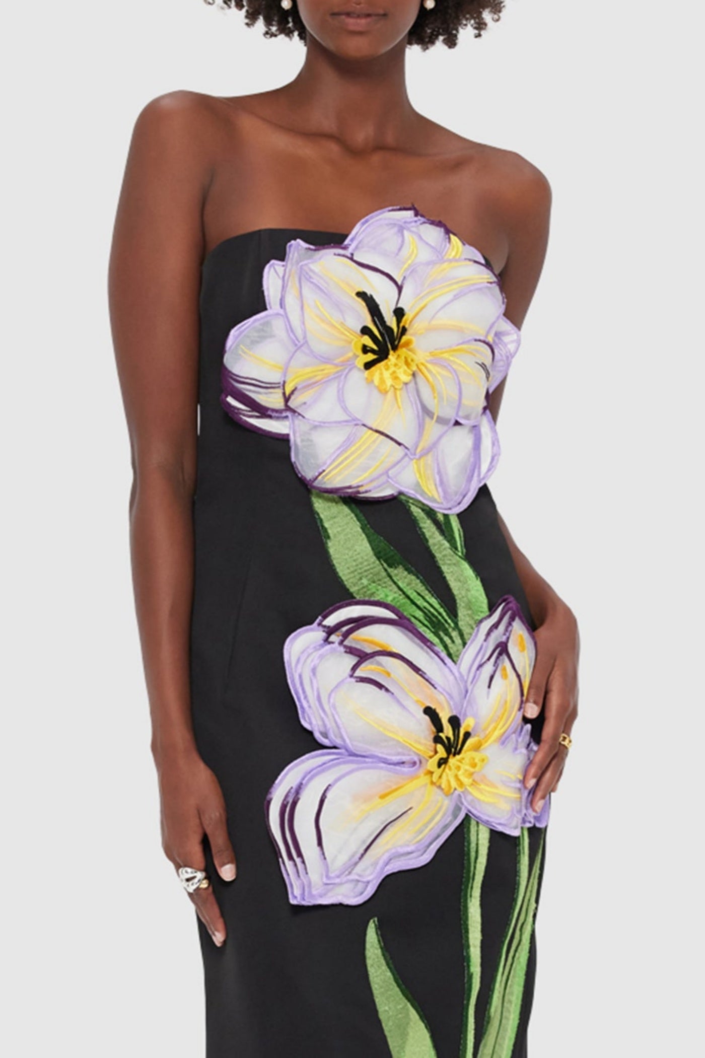 Mimoza Floral Appliqué Strapless Midi Dress - Black