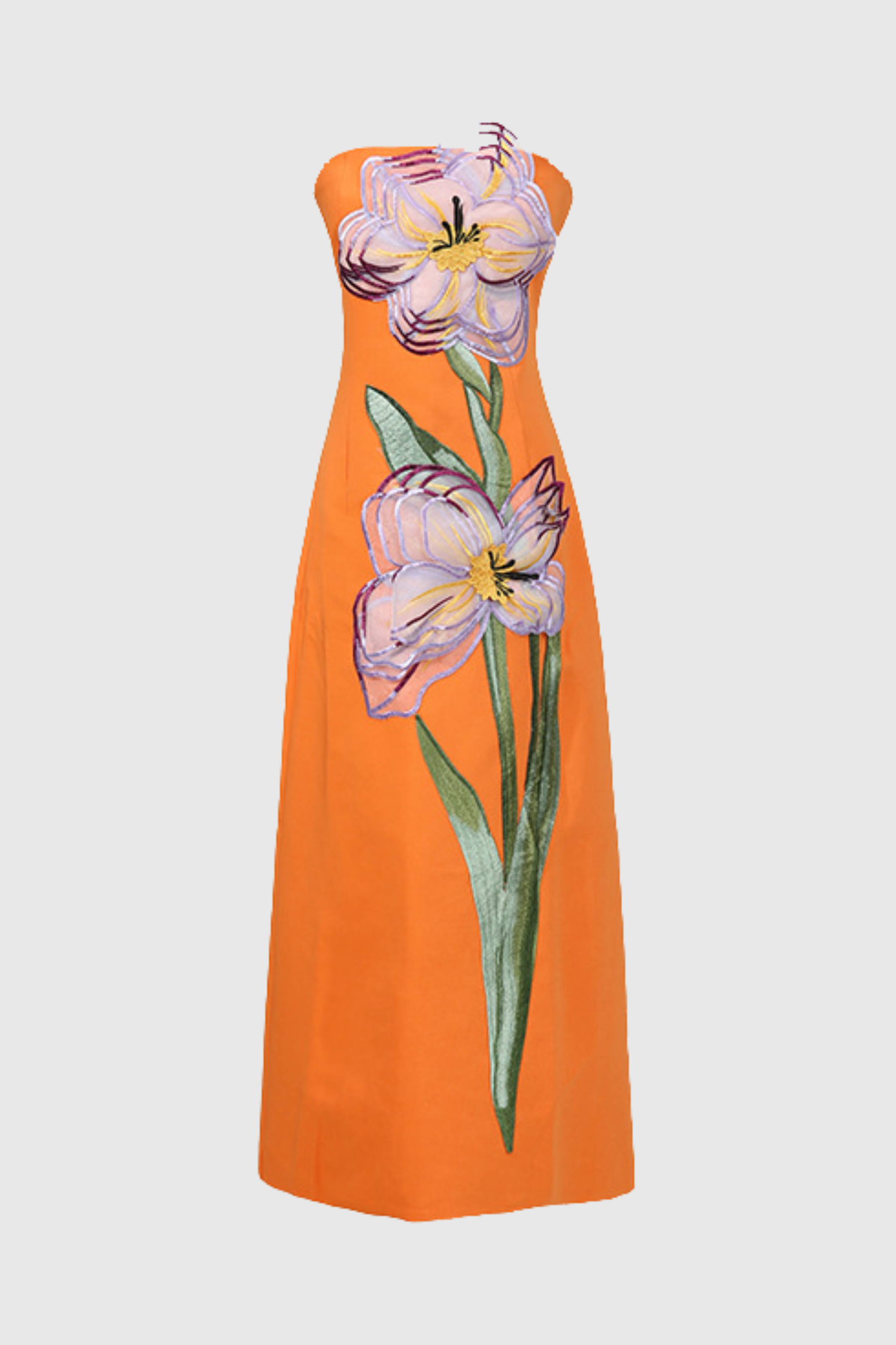 Elevate your elegance with the Mimoza Floral Appliqué Strapless Midi Dress in orange. This refined piece features delicate floral appliqués that add subtle texture and charm, while the strapless design highlights your neckline with grace. Its midi length offers a timeless silhouette perfect for sophisticated occasions, ensuring you stand out with understated beauty and confidence.
