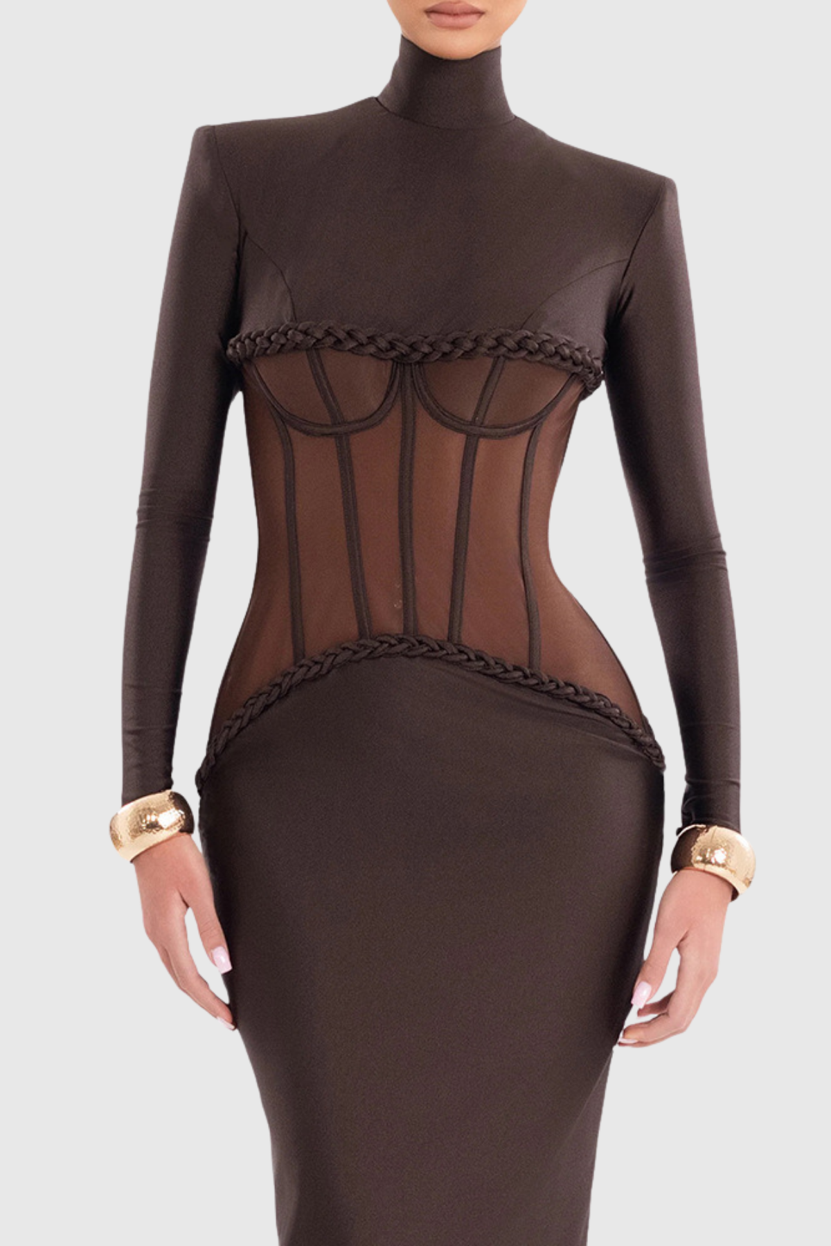 Elevate your style with the Mistey Corset Rope-embellished Maxi Dress, a striking blend of elegance and intricate design. Featuring a tailored corset silhouette accentuated by delicate rope embellishments, this dress contours to enhance your figure while adding a refined texture. Its flowing maxi length creates a graceful movement, perfect for sophisticated occasions where timeless charm meets modern detail.