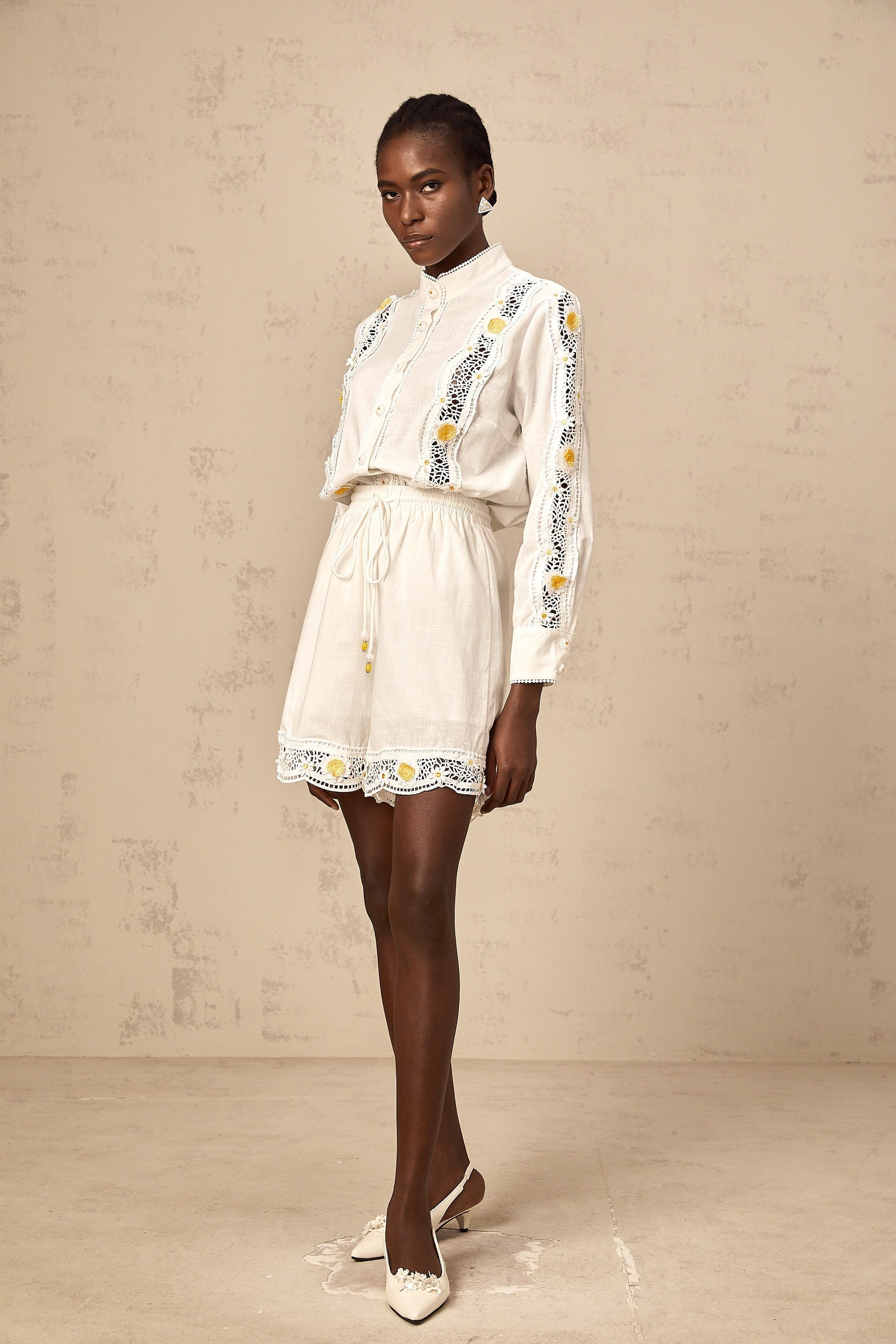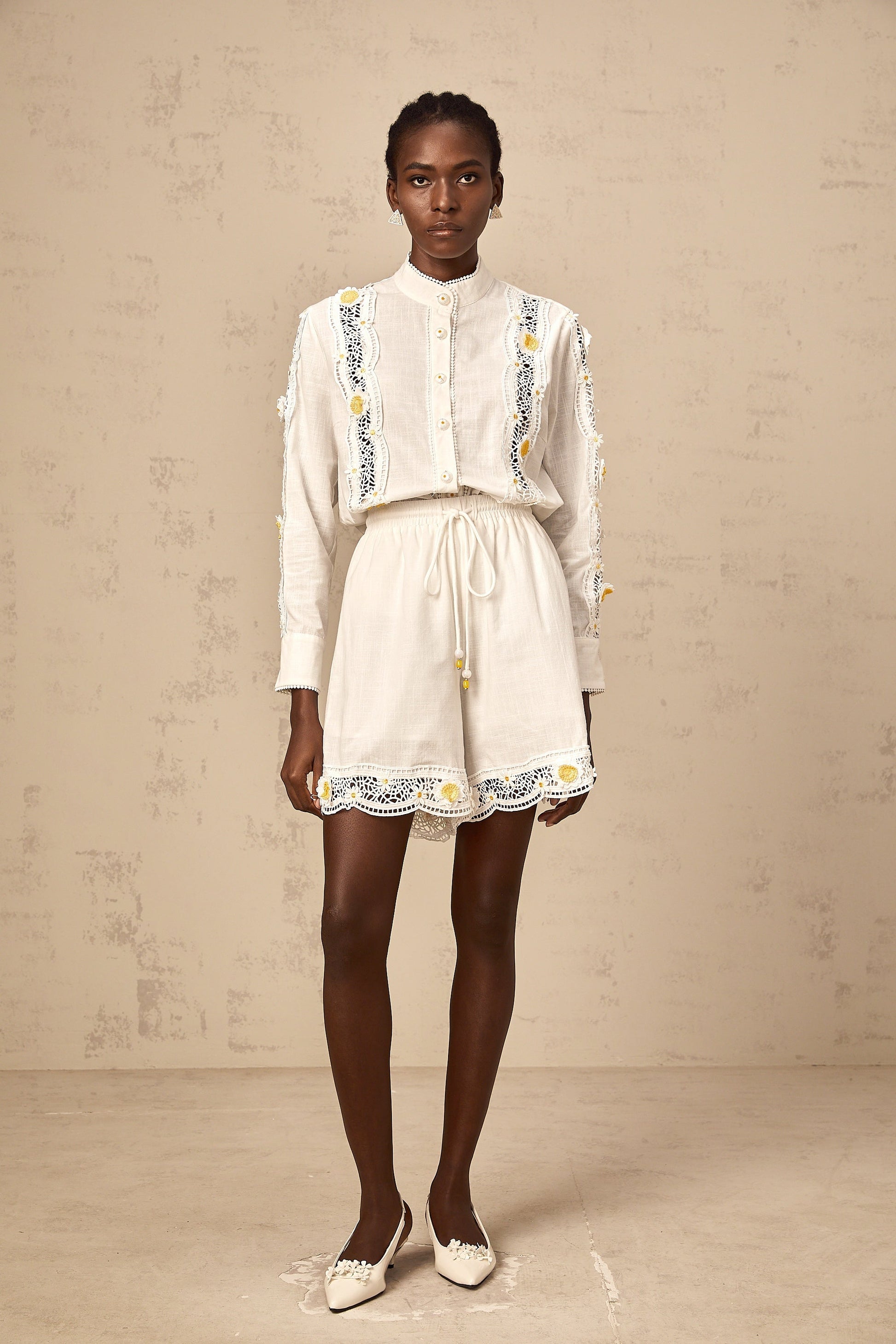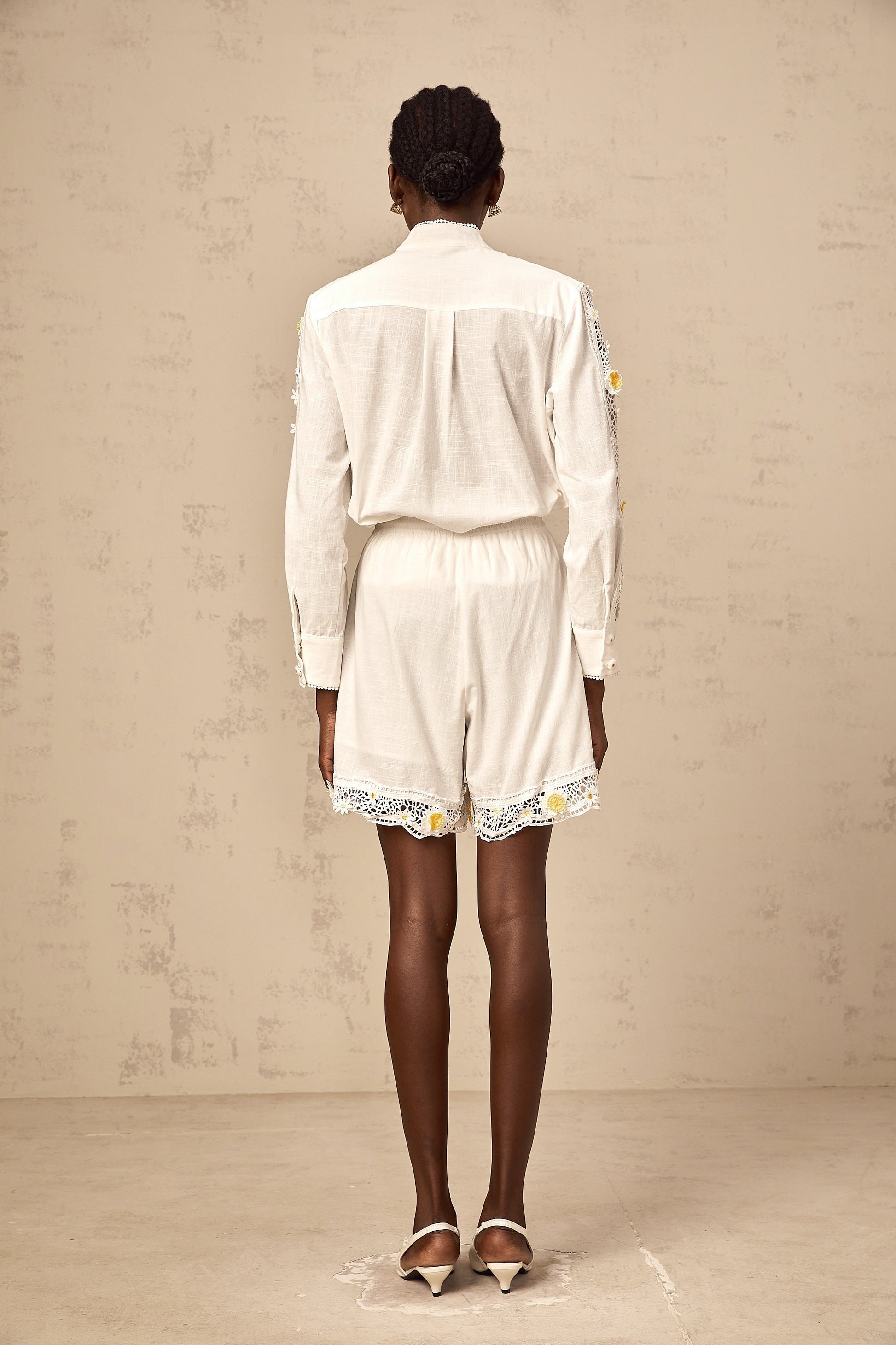 Mylène white 3d-petal lace-trim shirt & shorts matching set