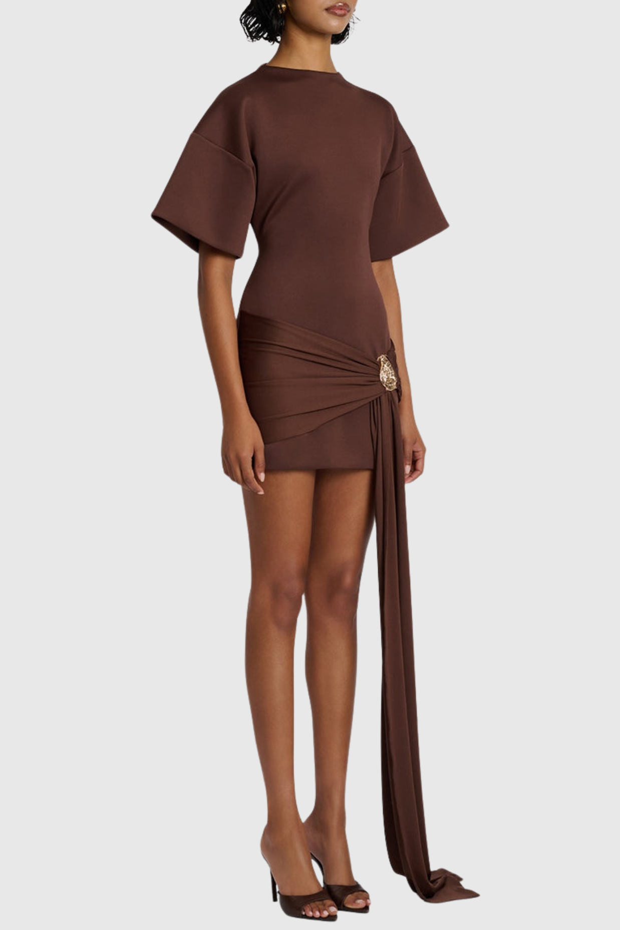 Elevate your evening wardrobe with the Natalja Draped Embellished Mini Dress in brown. This sophisticated piece features elegant draping and subtle embellishments that catch the light gracefully. Its flattering silhouette and rich brown hue make it perfect for refined occasions, ensuring you stand out with timeless style and understated glamour.