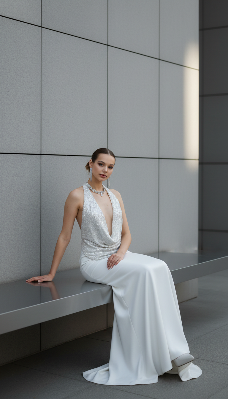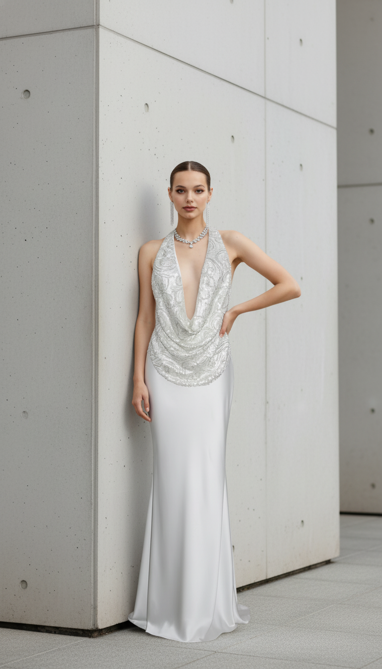 Maison Celie Halter Neck Satin Gown – Radiate sophistication in this stunning halter neck gown, designed with luxurious draped detailing at the bust and a smooth satin finish. The delicate silver beading adds a subtle touch of glamour, making this dress a perfect choice for evening events and formal occasions. With its sleek, floor-length design, this gown beautifully sculpts the figure while exuding timeless elegance and grace. Whether it’s a gala, a wedding, or any special celebration, this dress promises to make you the center of attention.