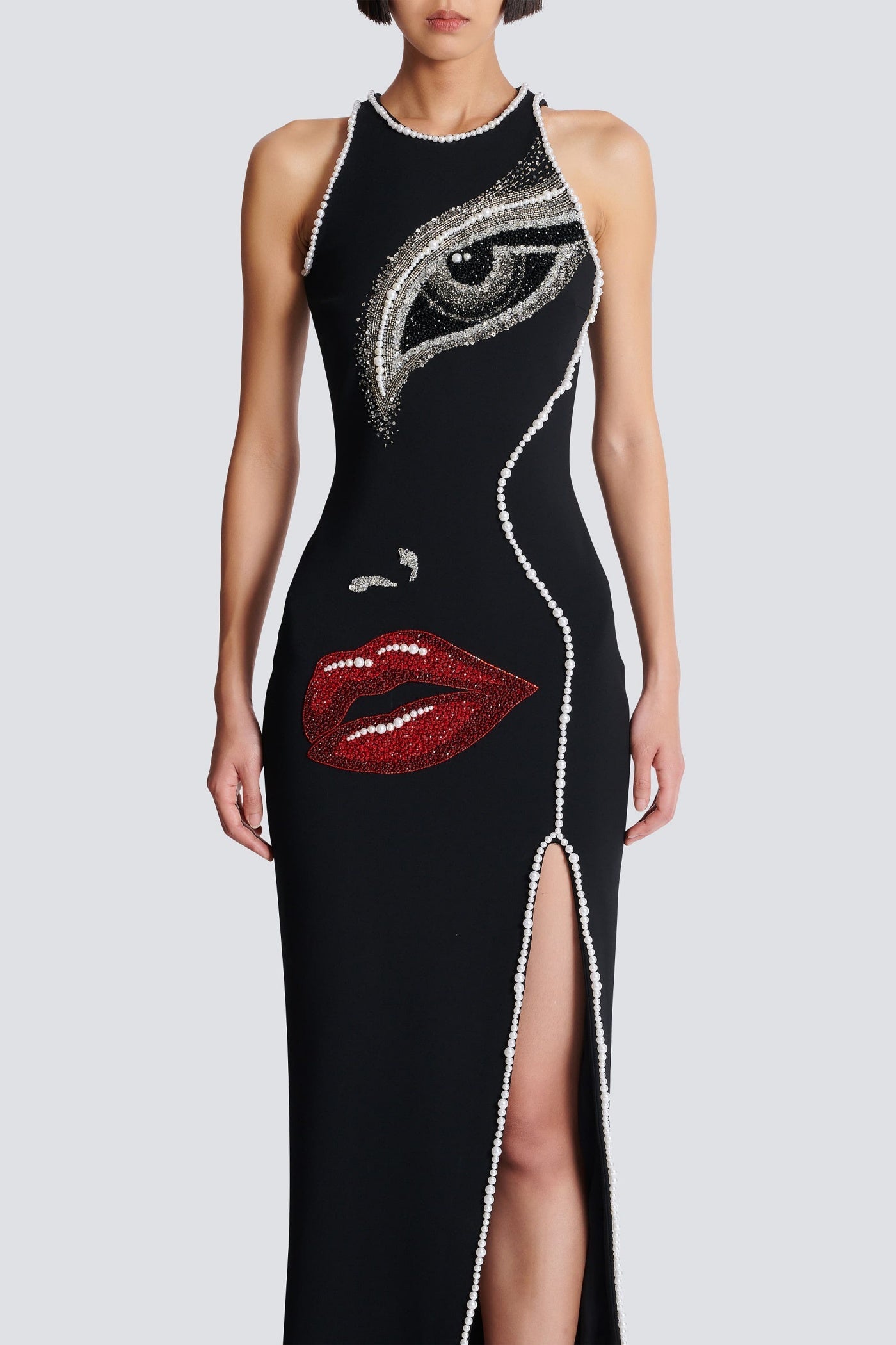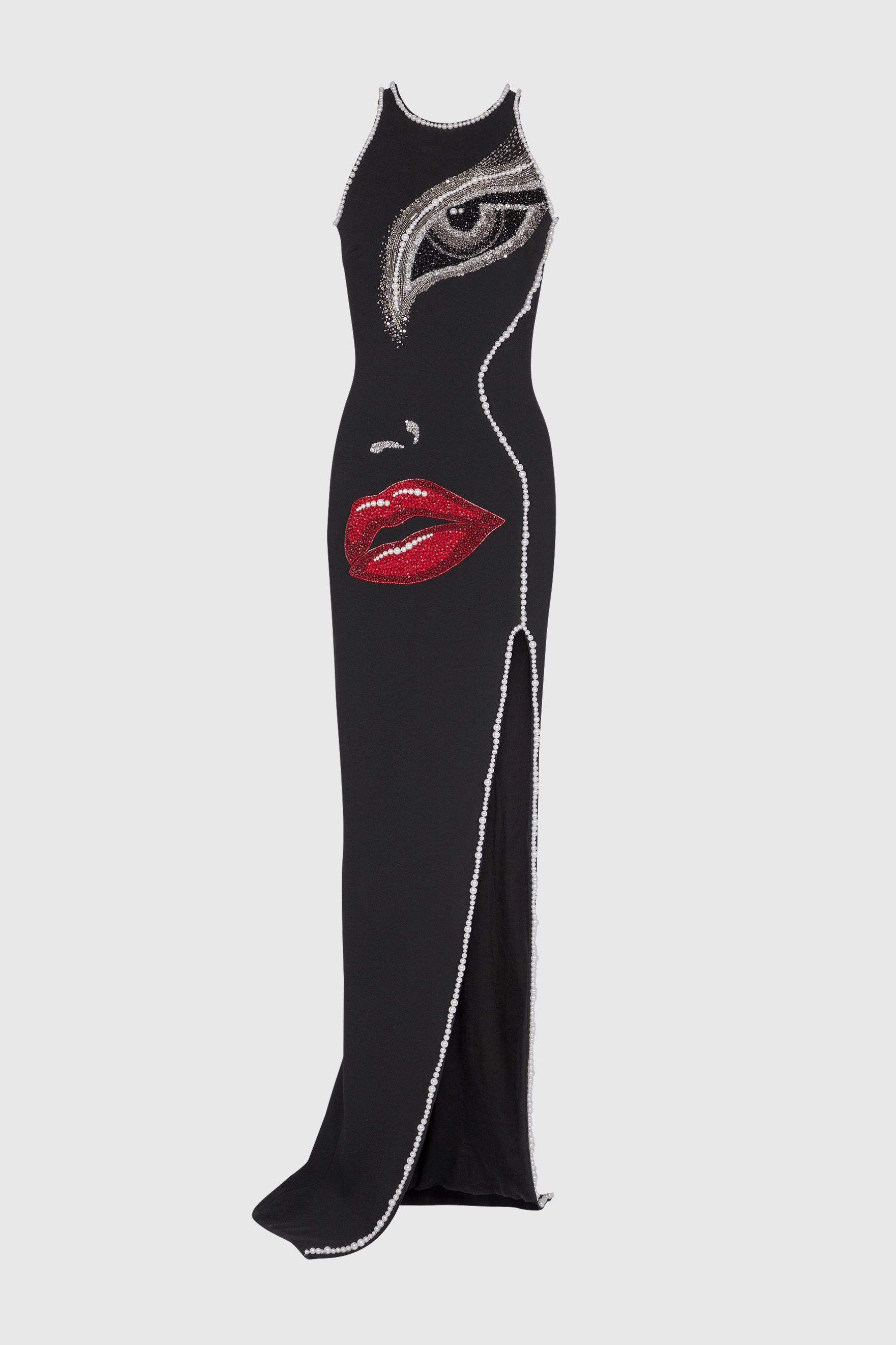 Nikkol Face Motif Pearl Embellished Split Maxi Bandage Dress