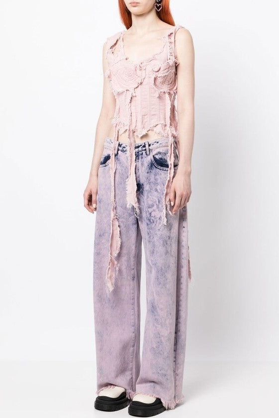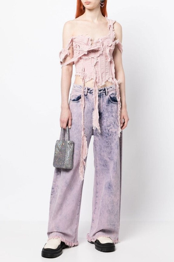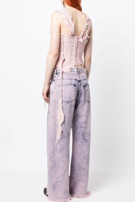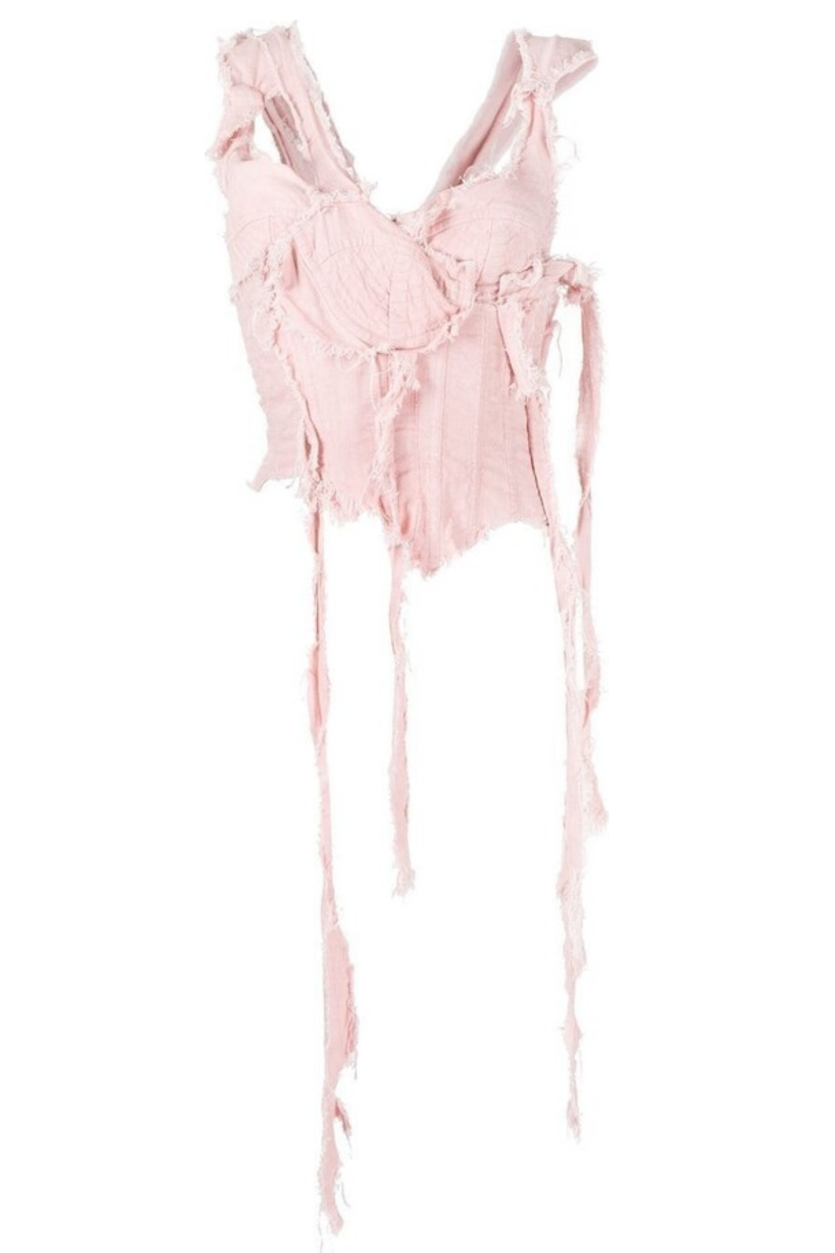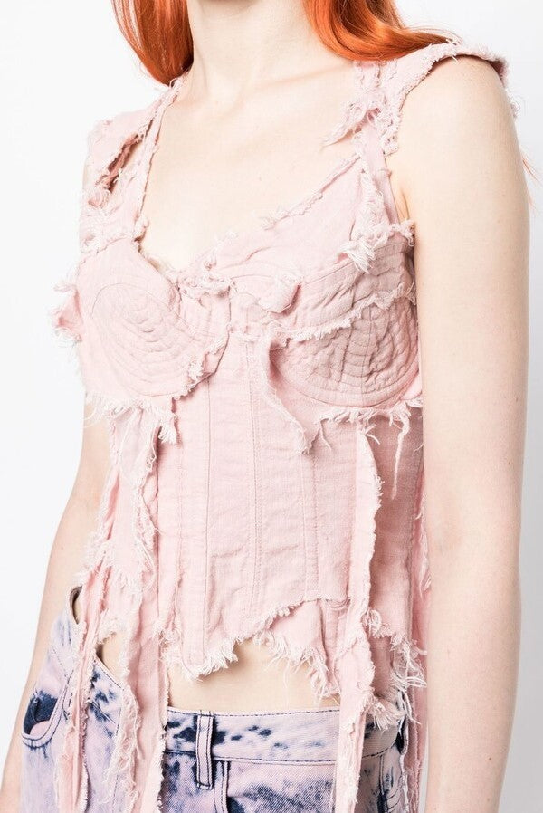 Take a daring step with the Noela Asymmetric Fringed Corset in Pink. Experience the bold and dynamic design featuring striking fringe details that will surely make a statement. Embrace the distressed-effect of this bold and edgy corset, complete with playful fringed detailing. Conquer your next fashion statement and bring an adventurous flair to any outfit. Dare to be different with Noela!