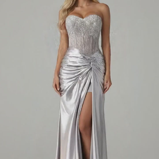 Luxurious Silver Beaded Corset Satin High-Slit Evening Gown