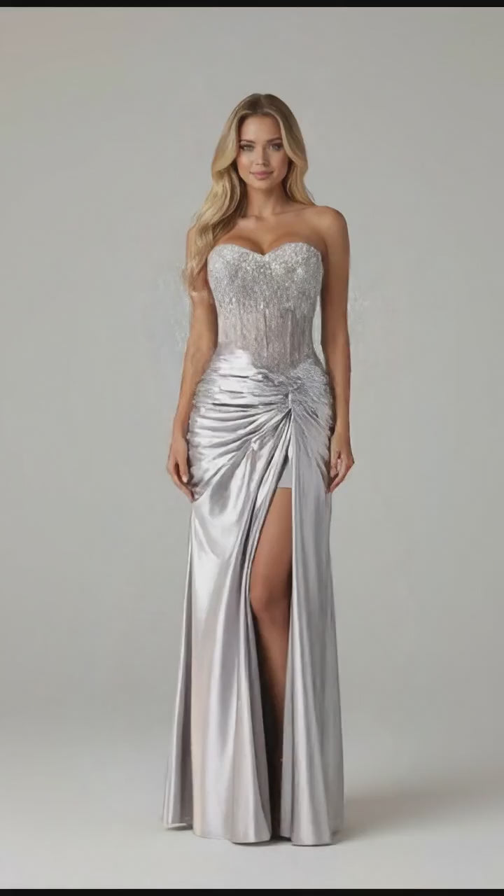 Description Shine like a star in this exquisite silver evening gown. The sheer corset bodice is intricately hand-embellished with sparkling beads and crystals, offering a glamorous contrast to the smooth, lustrous satin skirt. A dramatic gathered waist and thigh-high slit add a touch of modern sensuality to this red-carpet-ready masterpiece.