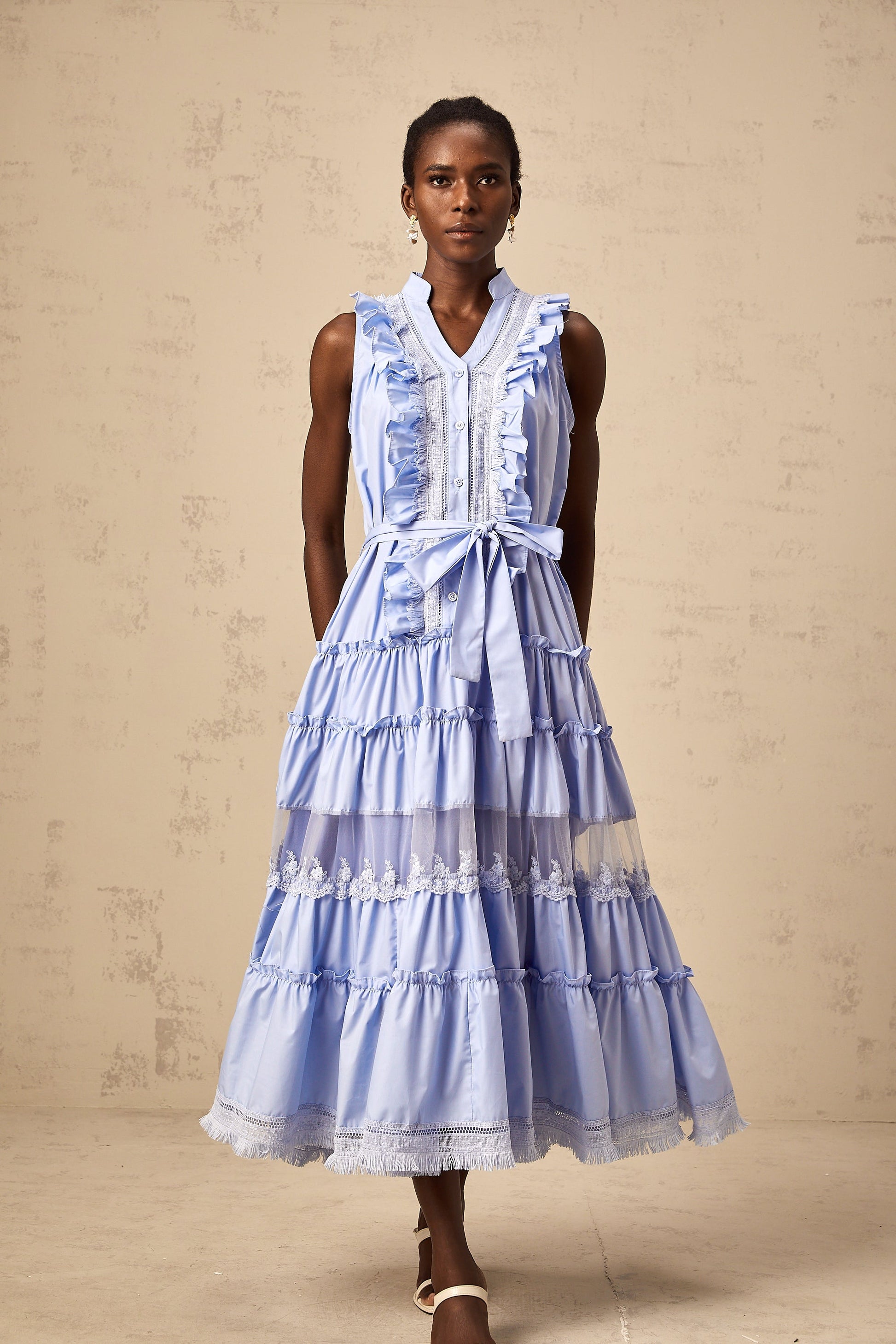 Olena blue ruffled floral-lace trimmed tiered midi dress