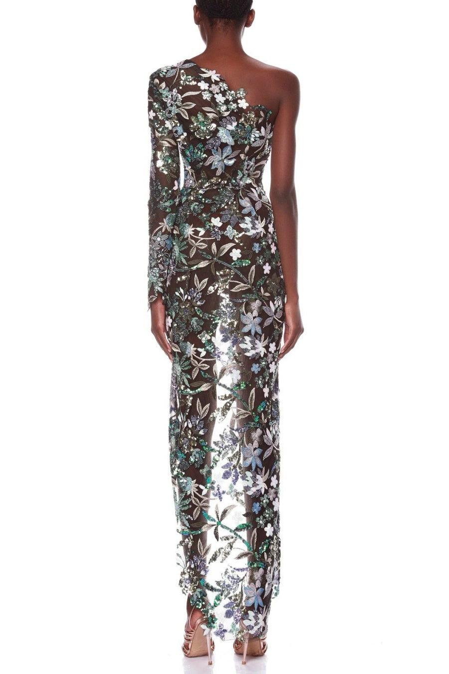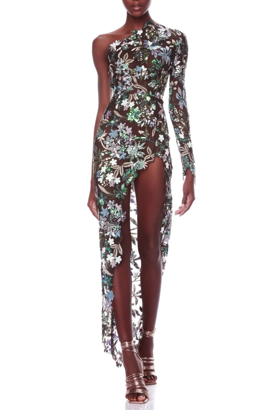 Opal Floral Sequin Embroidered One Shoulder Midi Dress - Green