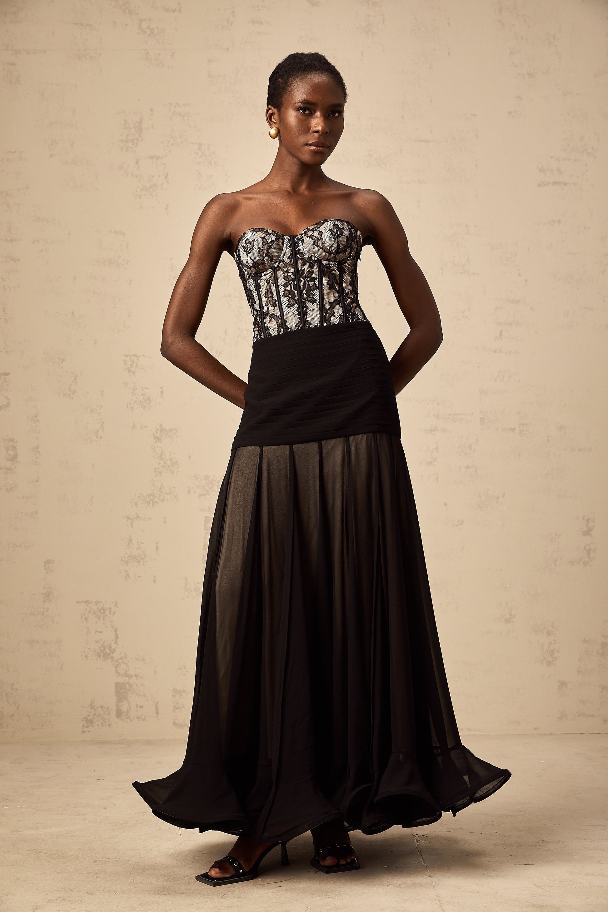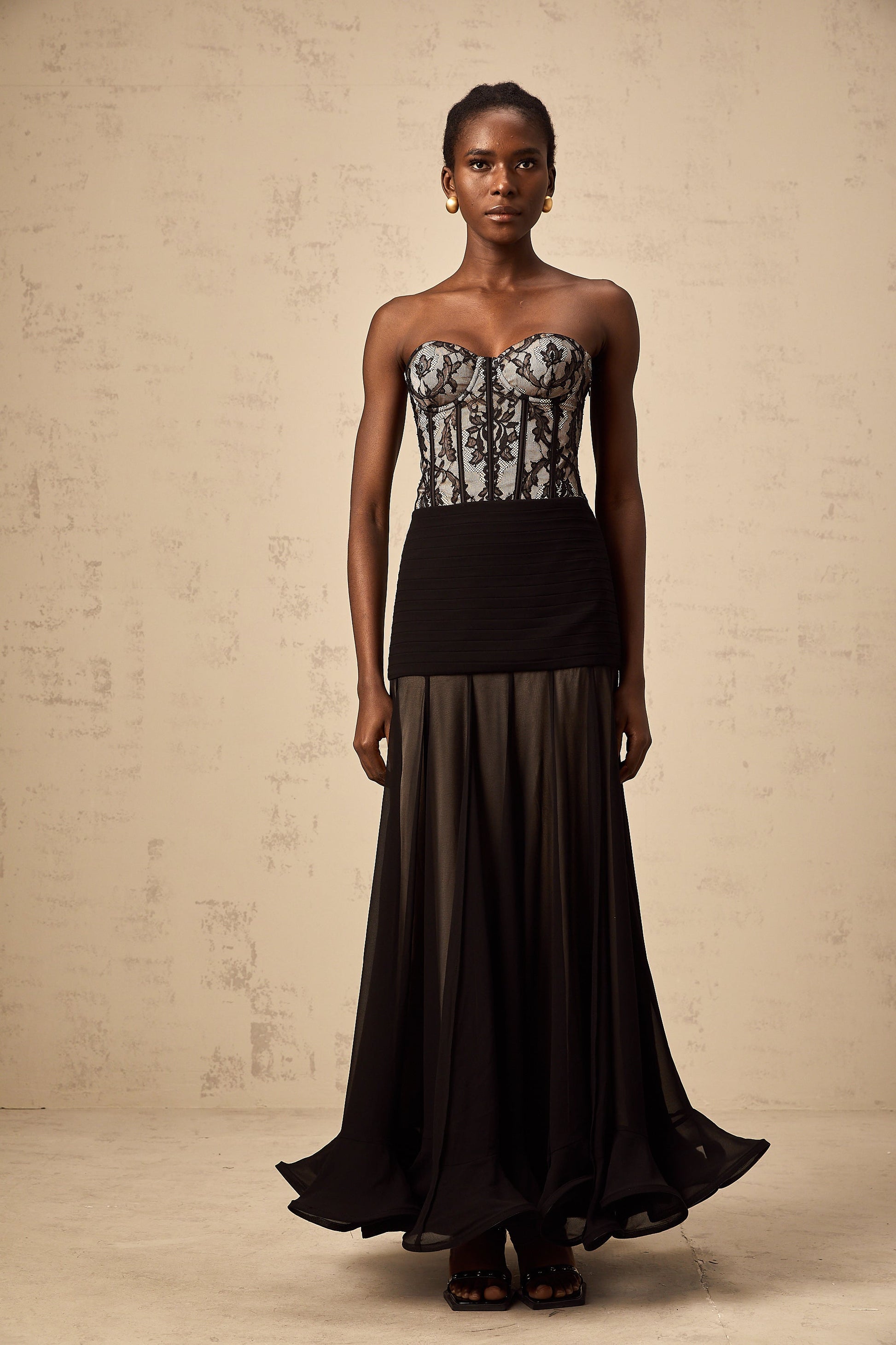 Pétunia black lace flounce maxi dress