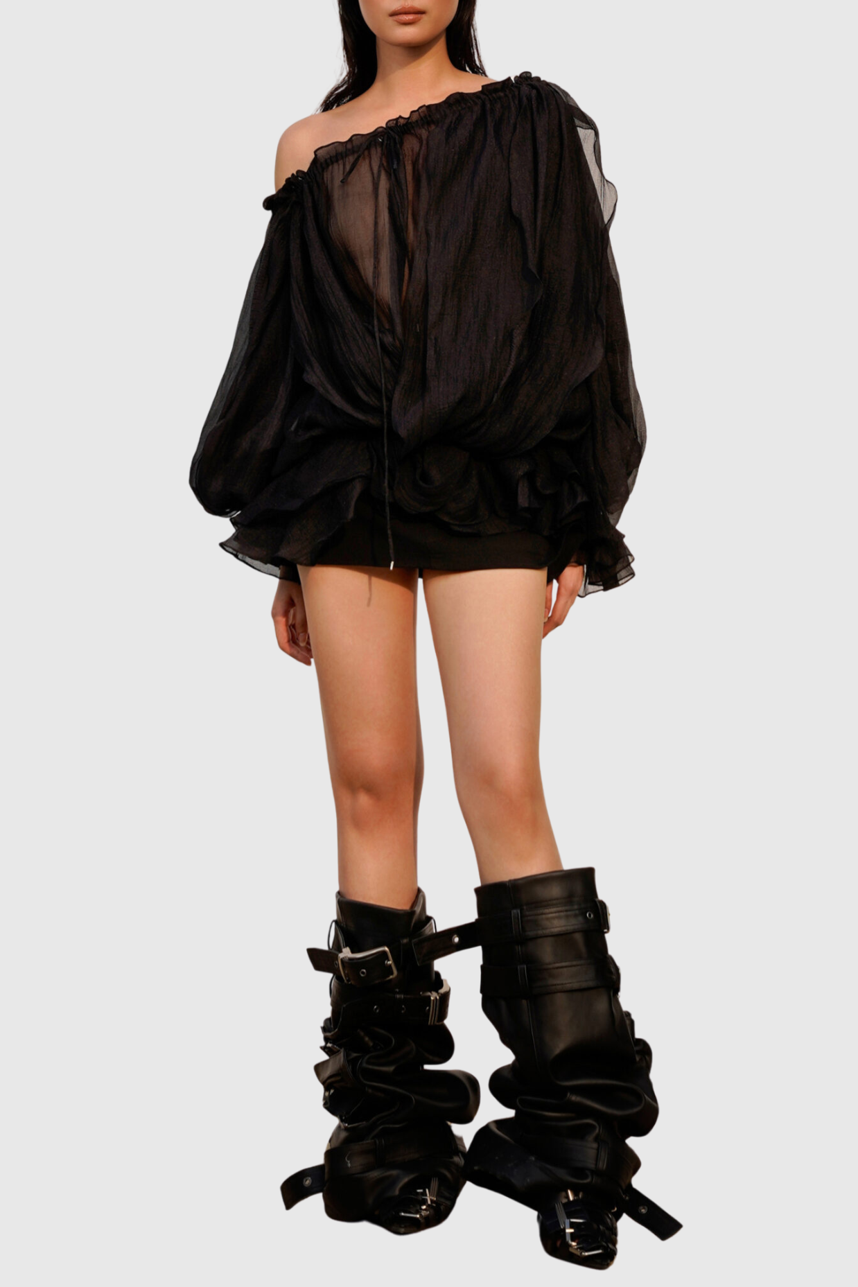 Pineda Off Shoulder Ruched Ruffle Blouse - Black