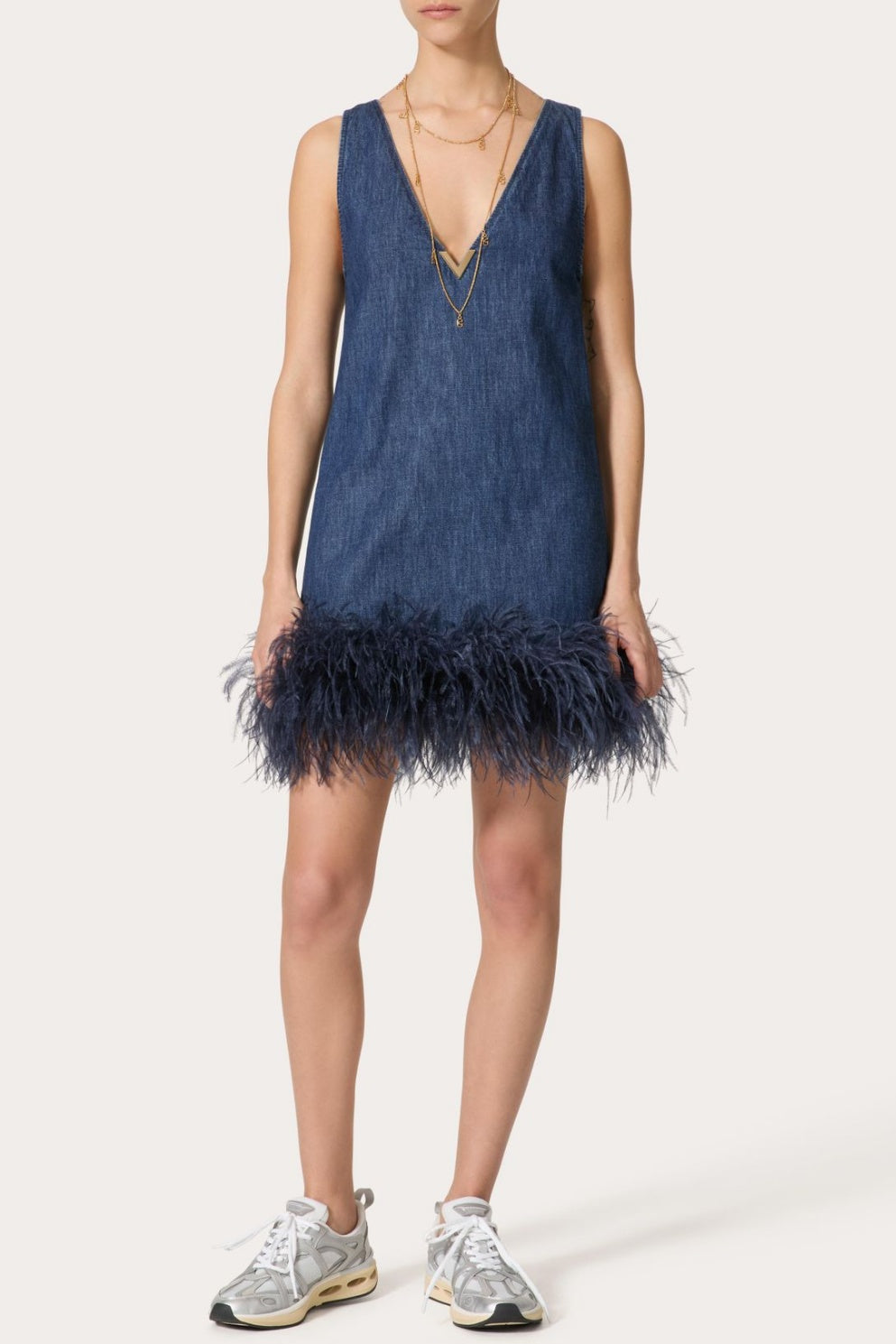 Introducing the Poppa Feather Trim Denim Mini Dress. This unique and luxurious dress features delicate feather details, making it a statement piece for any occasion. Elevate your style with this exclusive and sophisticated dress. Compliments guaranteed.