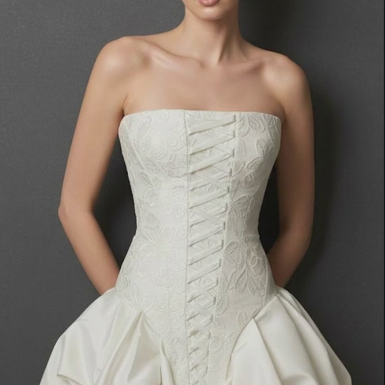 A voluminous bubble-ruffle skirt adds dramatic dimension, creating a perfect balance between softness and structure. The strapless neckline enhances the natural décolleté, bringing a modern touch of elegance, confidence, and allure.