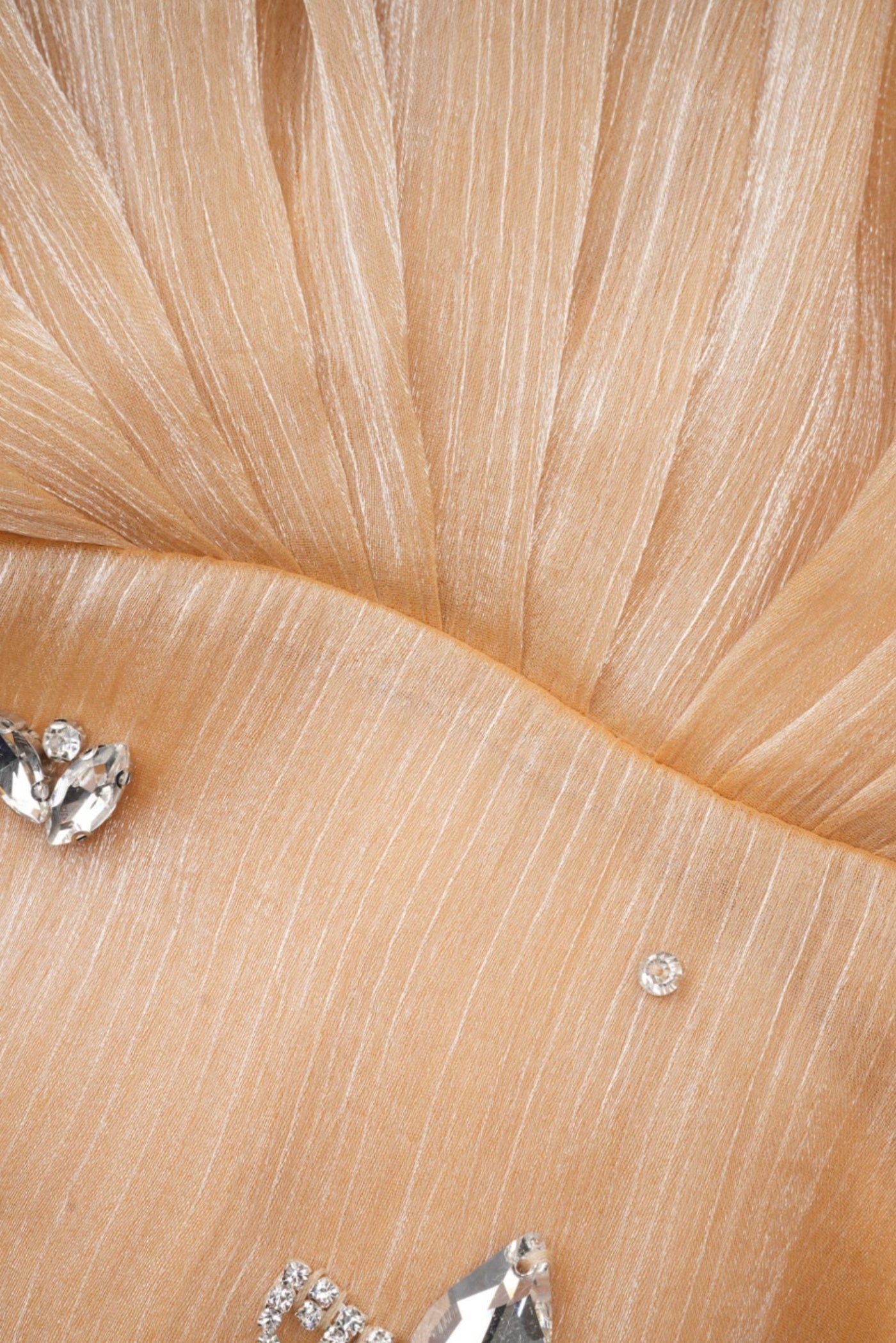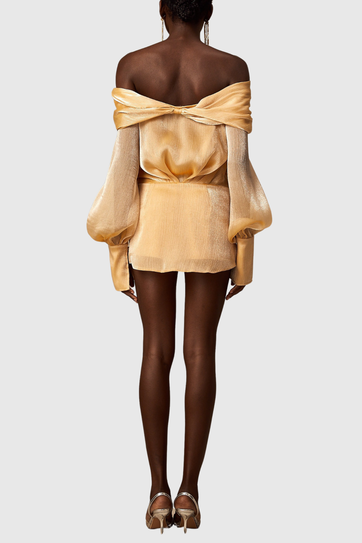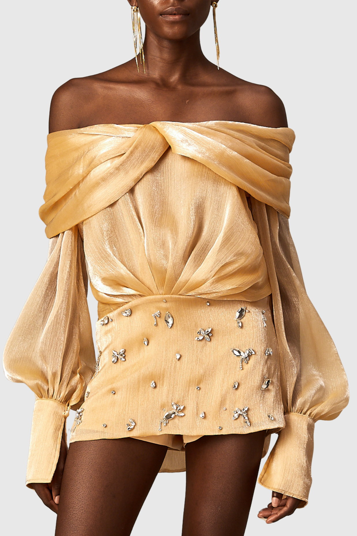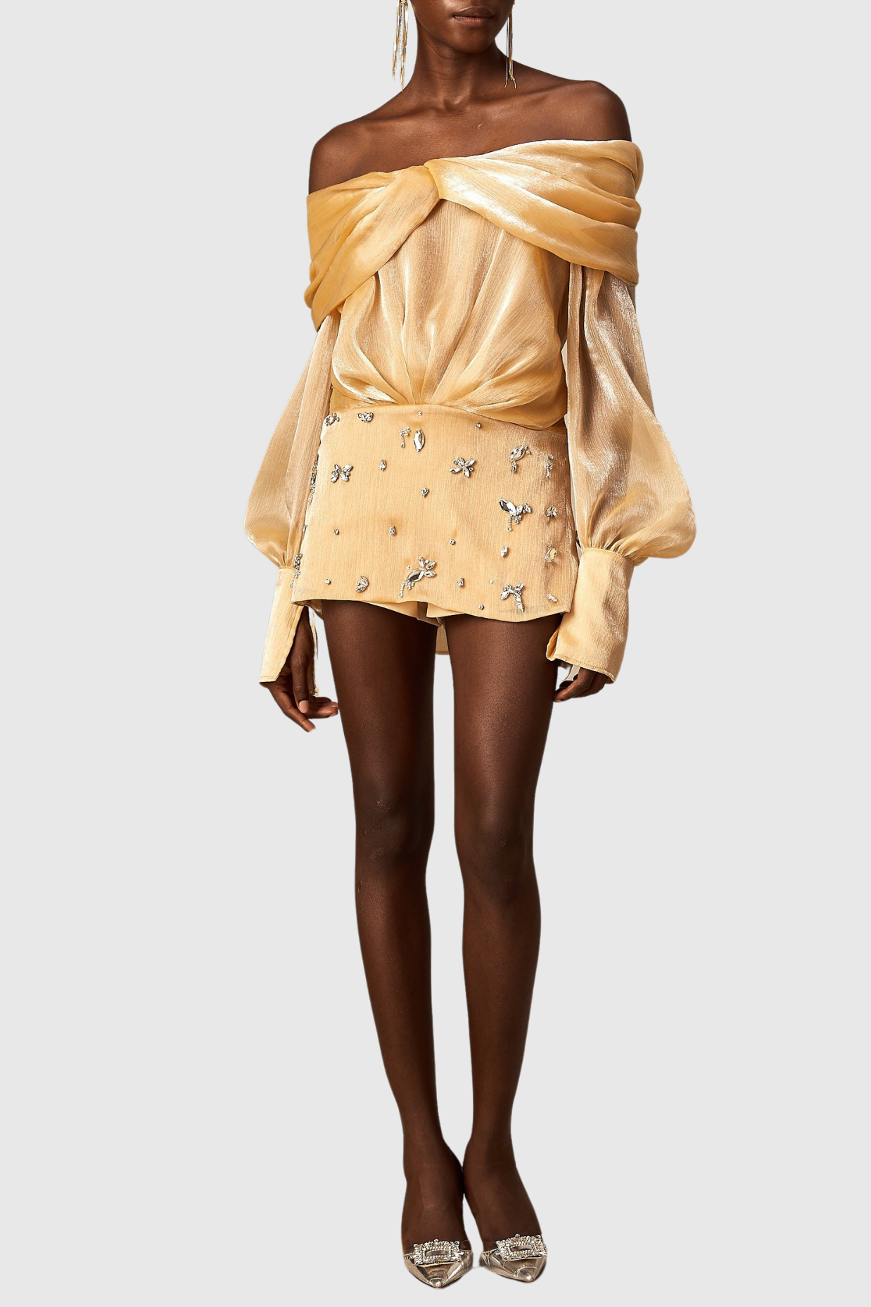 Rahar Gold Off Shoulder Rhinestone Embellished Mini Dress
