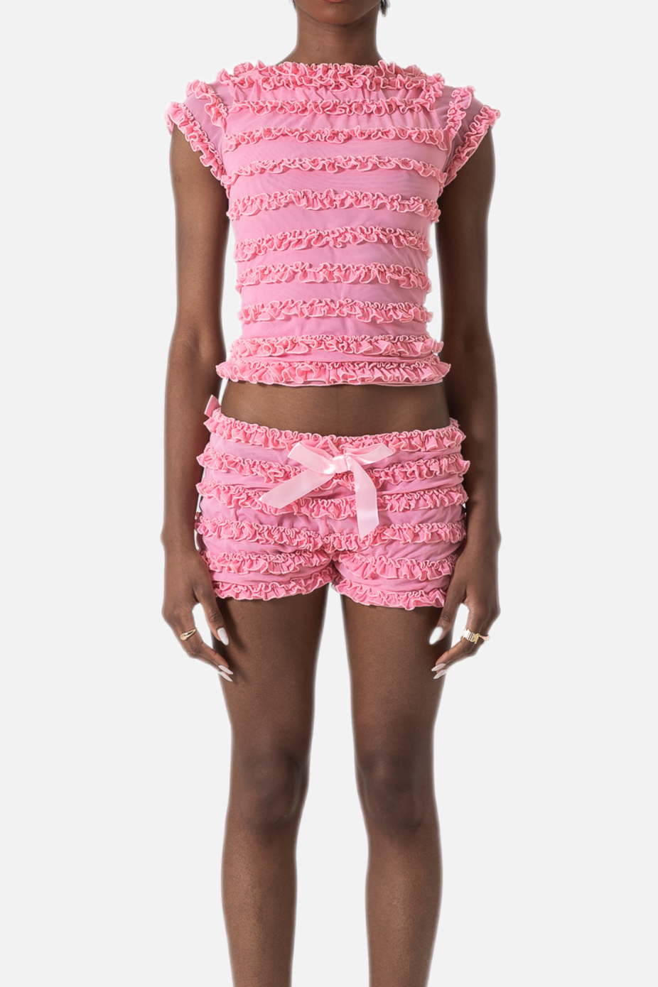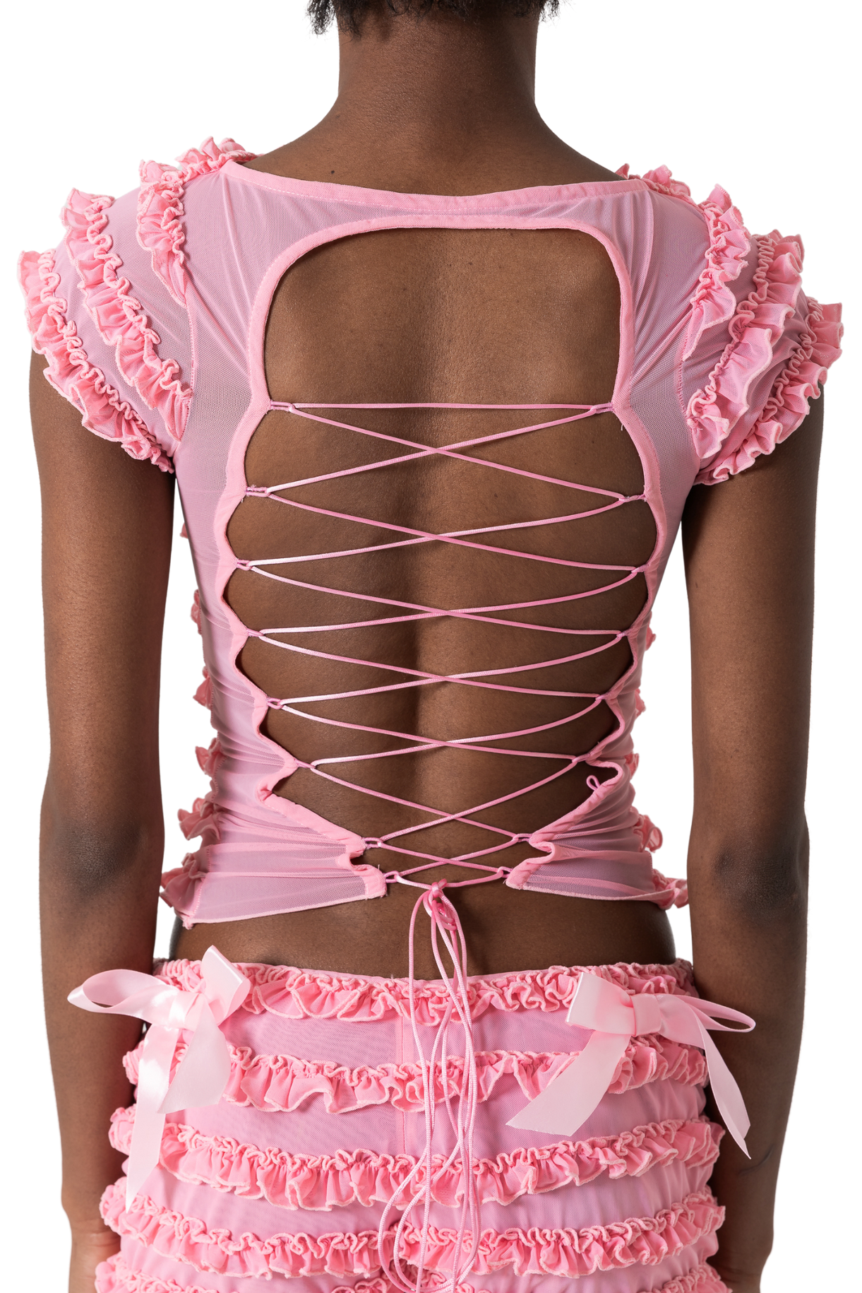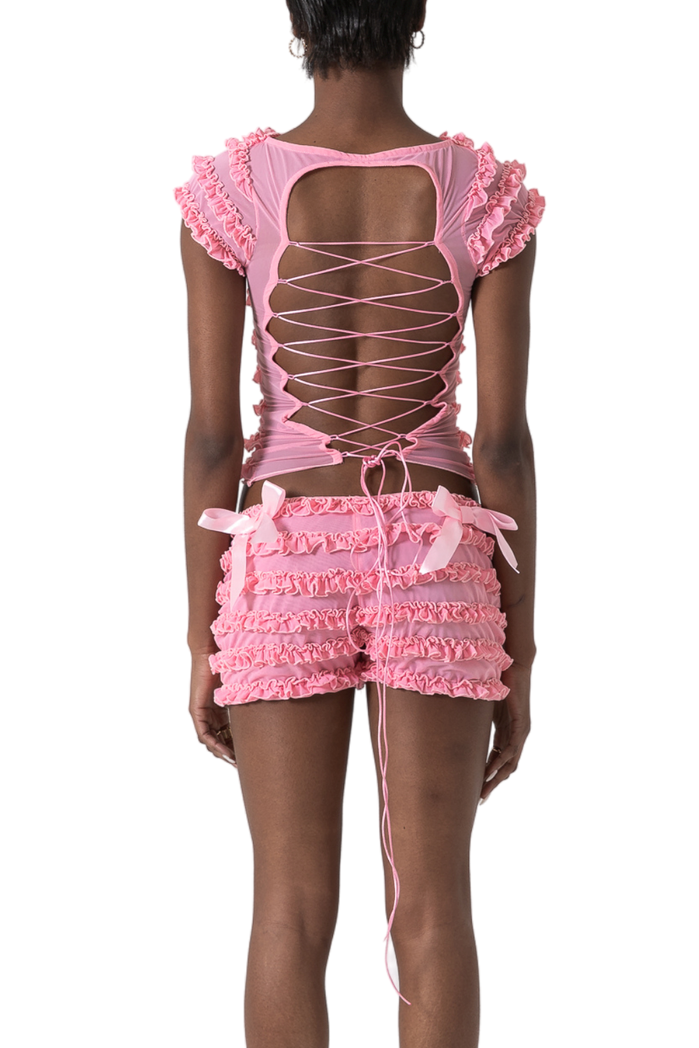 Get ready to slay in this show-stopping Raven Ruffle Backless Lace Up Set in Pink! The backless design and lace-up detailing add a touch of sass, while the ruffle accents give a flirty and feminine vibe. Perfect for a night out or a special occasion.