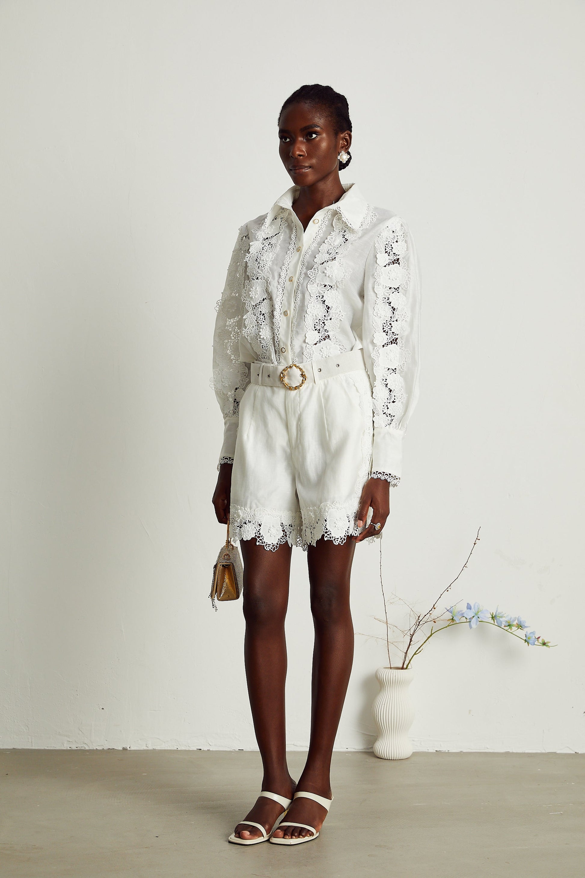 Rosalie lace-trim embroidered shirt & shorts matching set