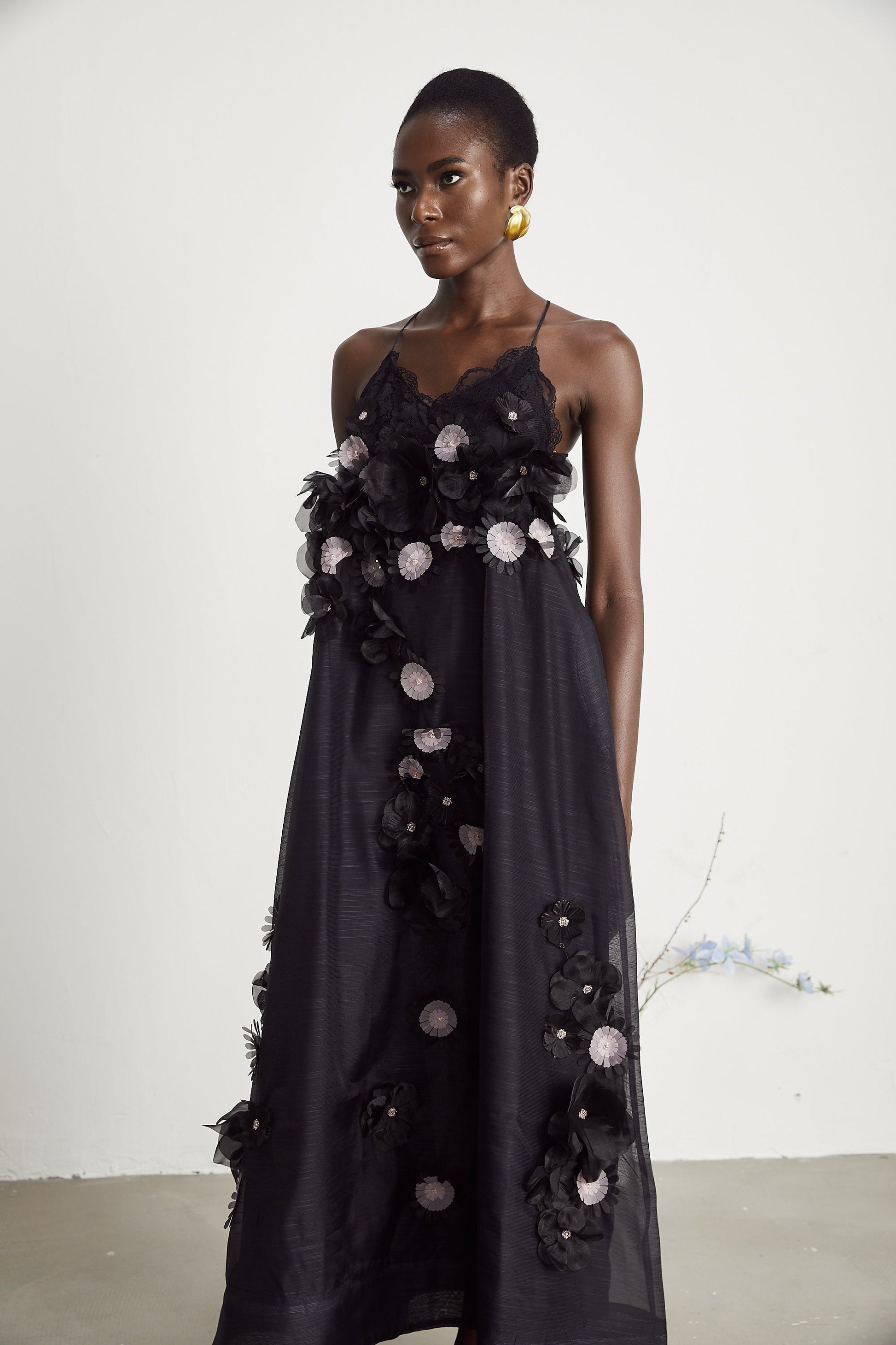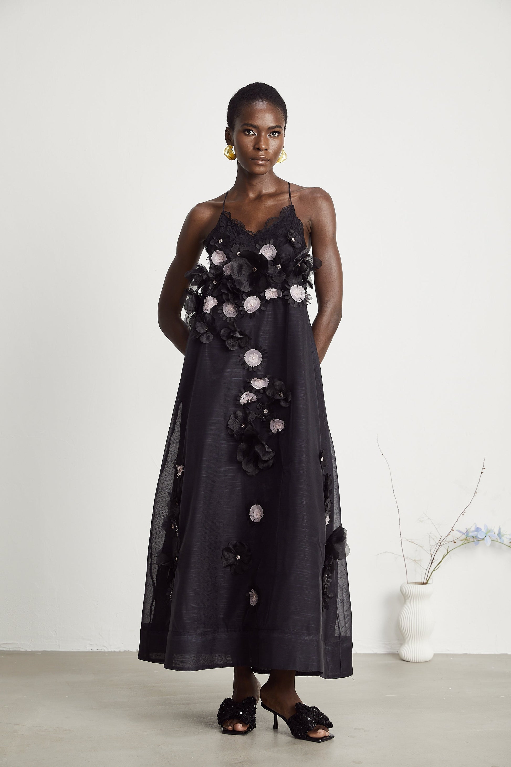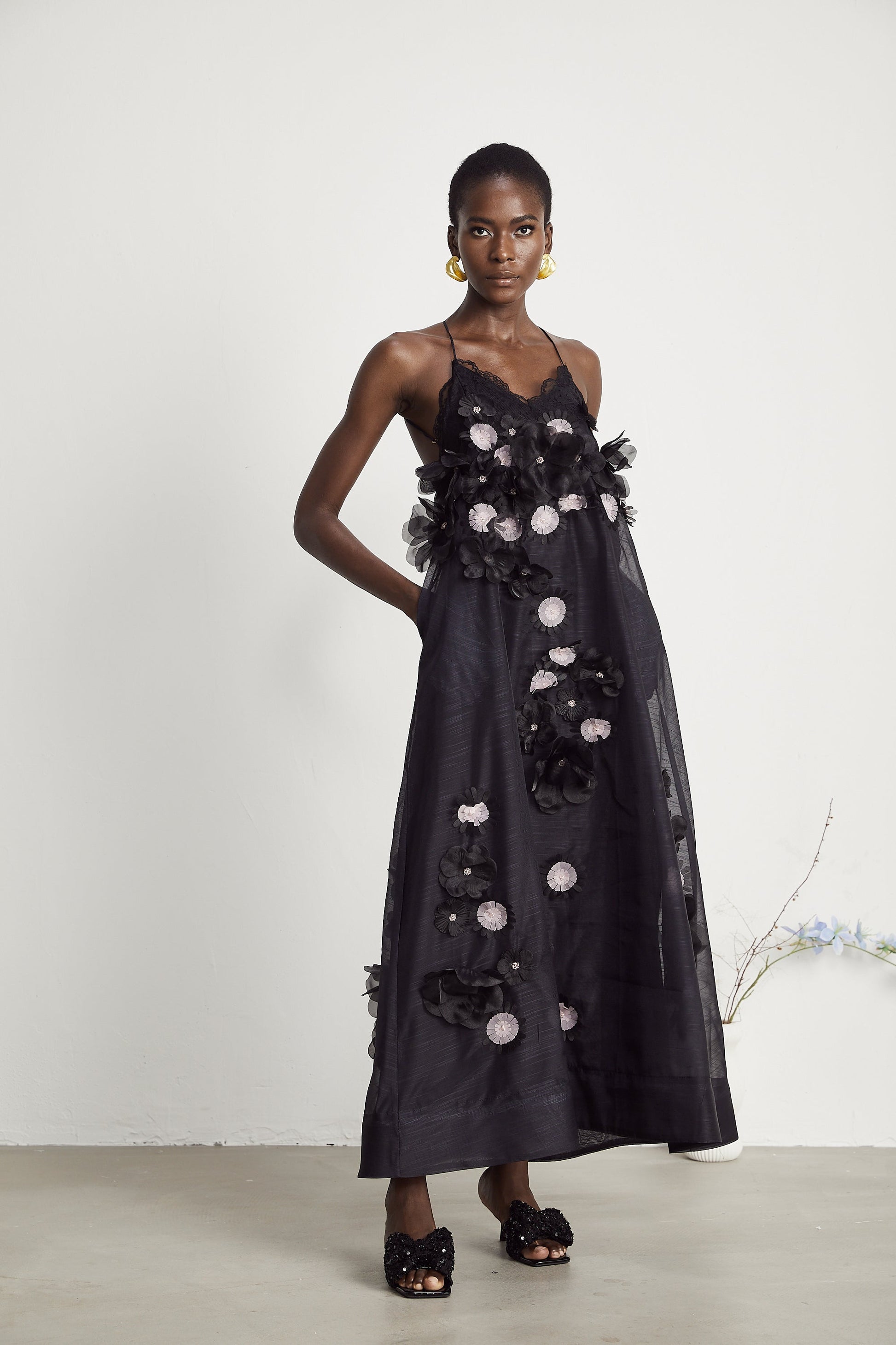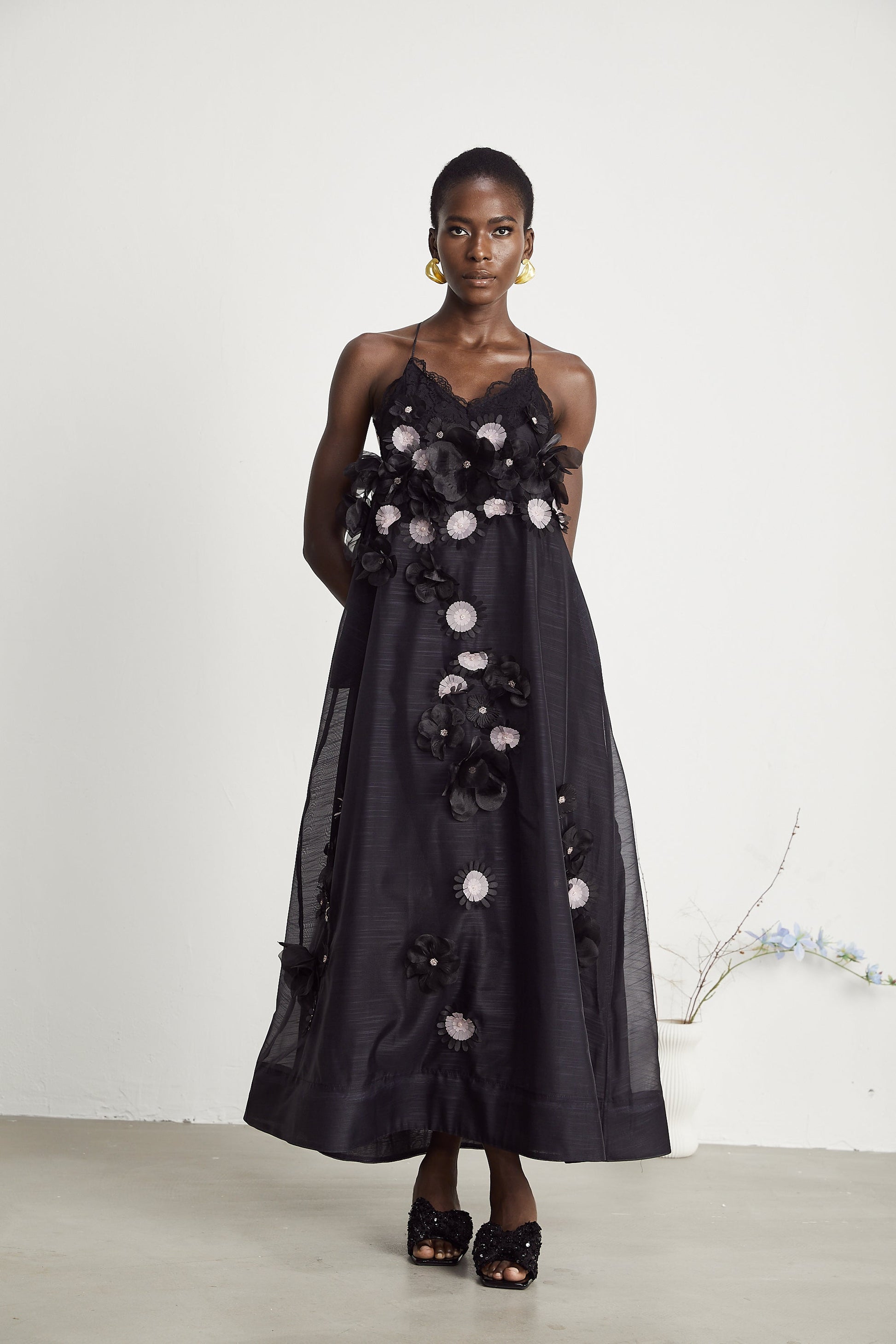 Sabine faux-floral embellished midi dress in Black