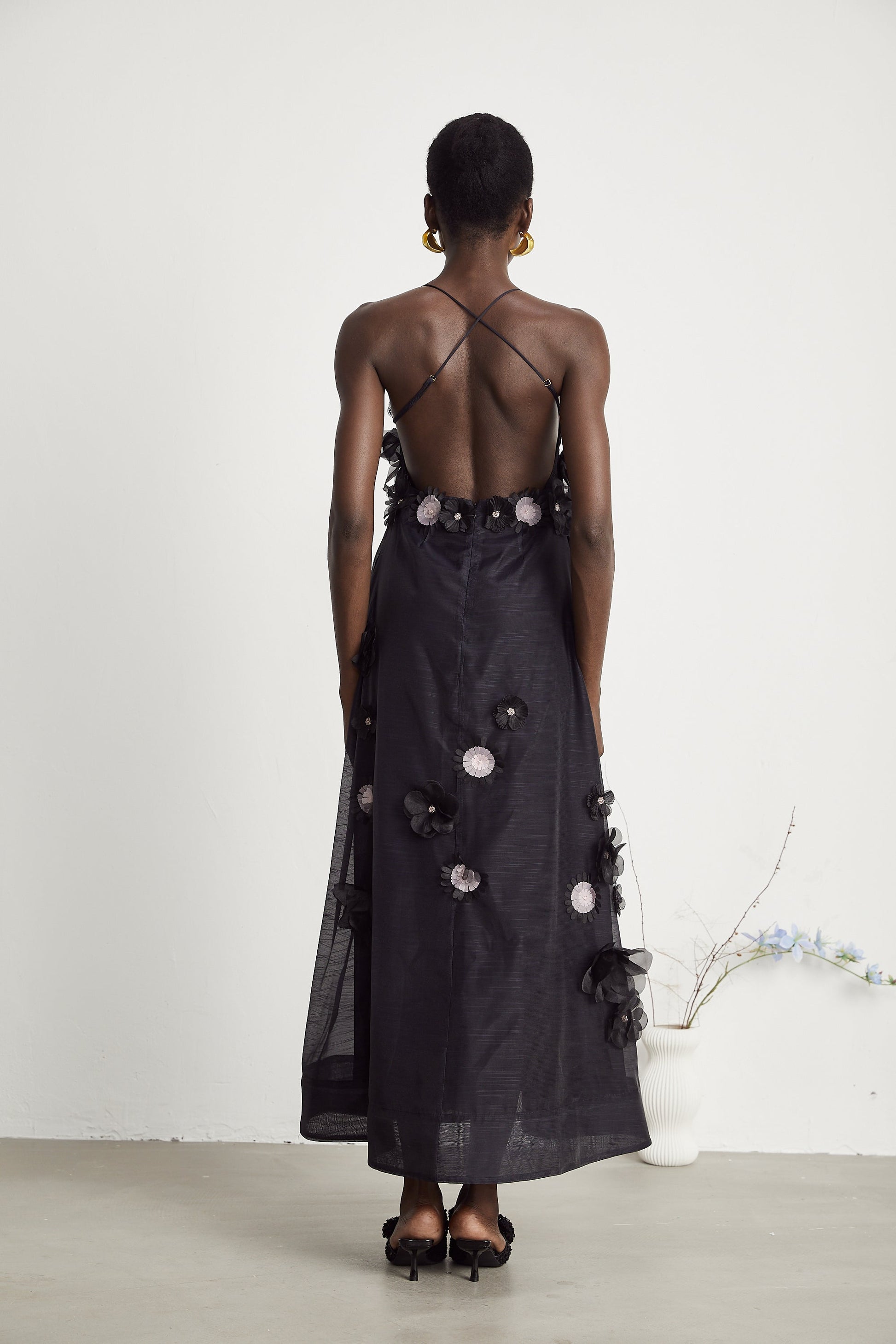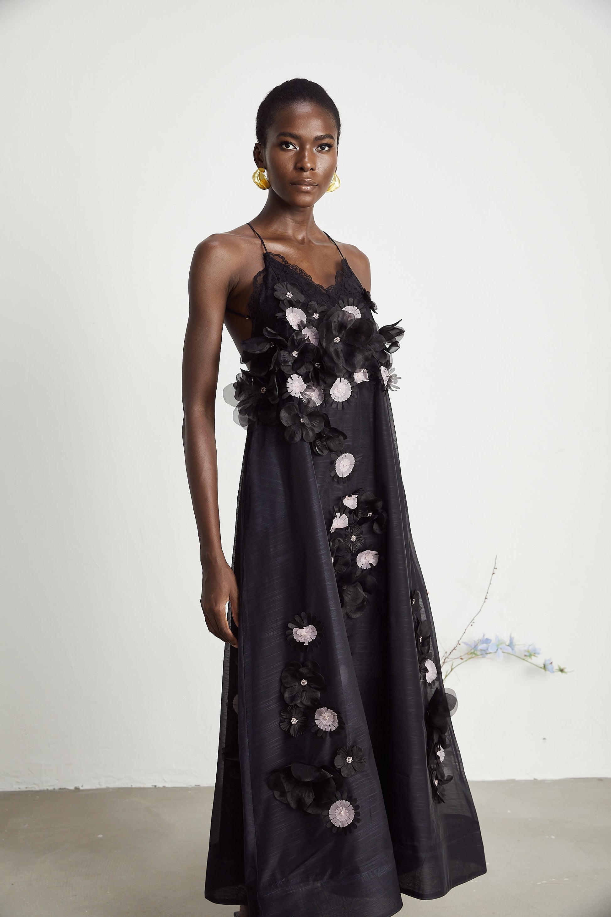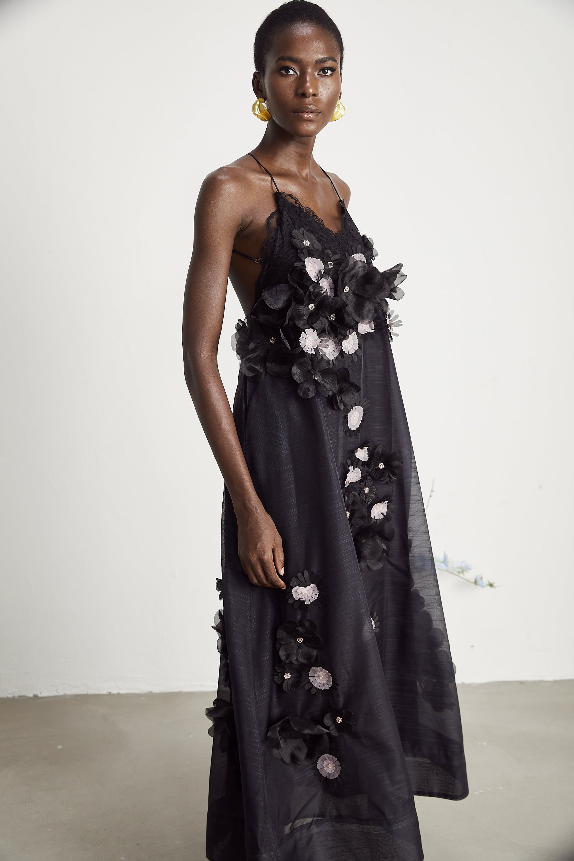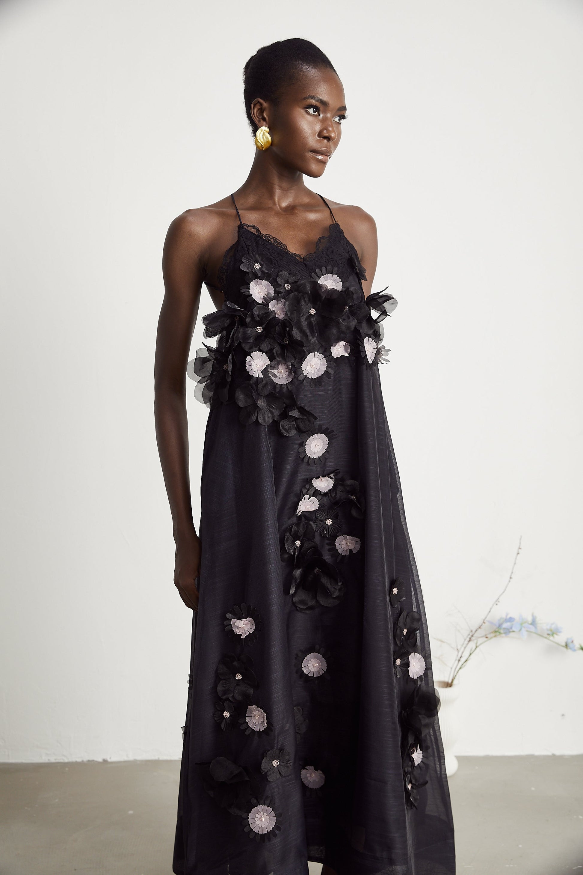 Sabine faux-floral embellished midi dress in Black