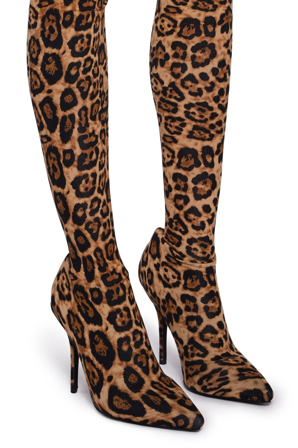 Take on the wild side with our Giselle Leopard Print Thigh-high Boots! These boots boast a fierce leopard print design and a bold thigh-high length. Perfect for those who like to take risks and make a statement with their fashion choices. Command attention and embrace your adventurous spirit with these boots.