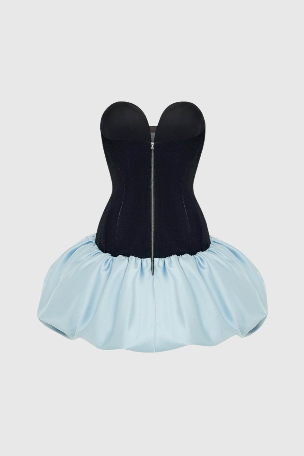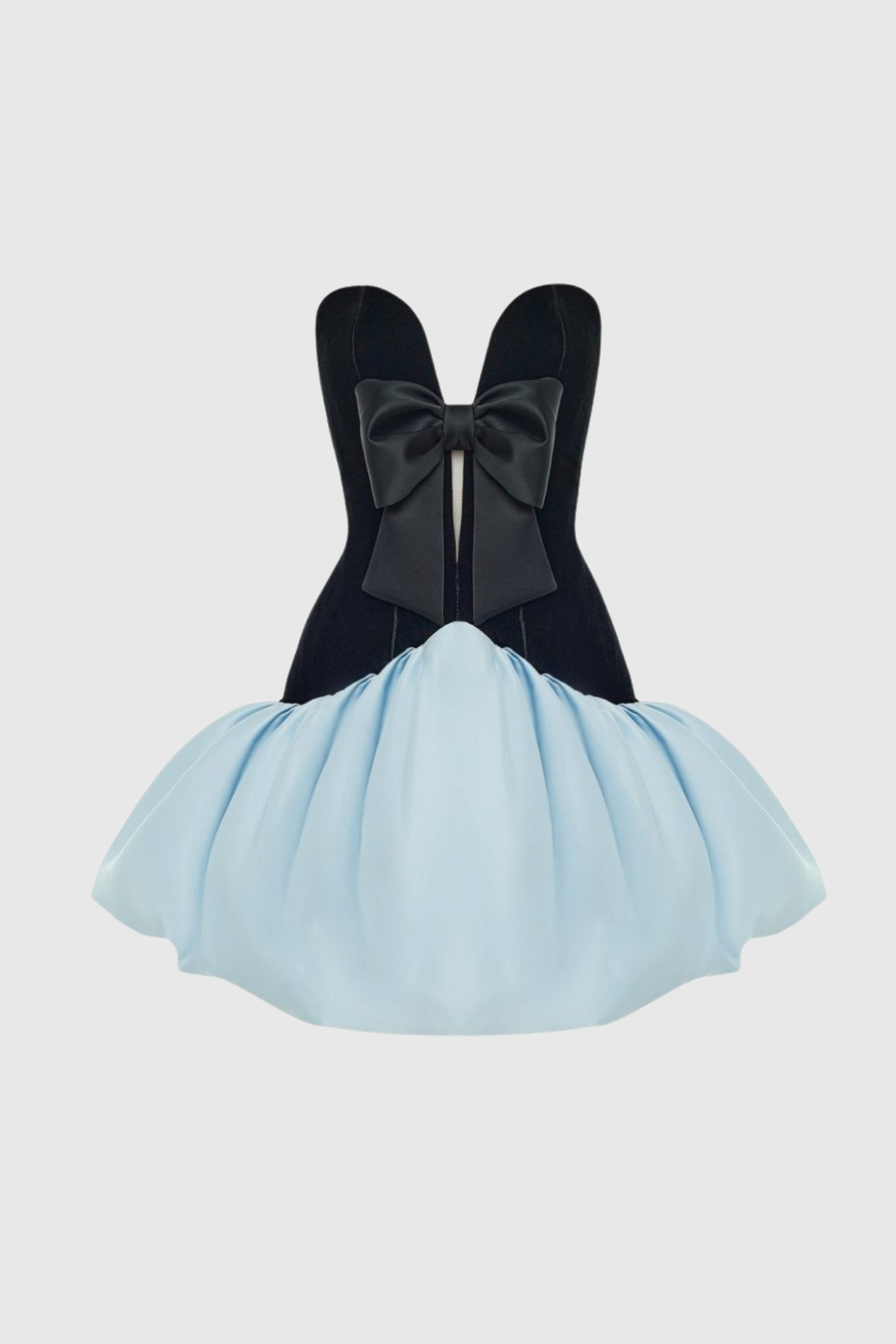 Stanski Strapless Velvet Bow Puffy Satin Mini Dress