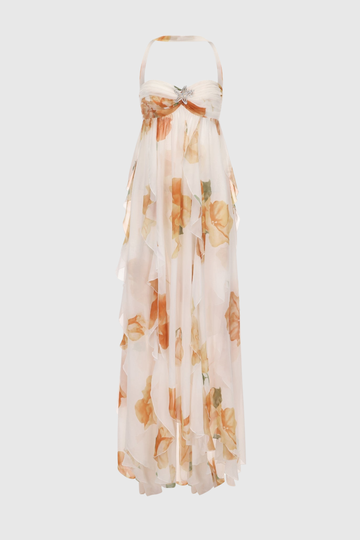 Indulge in luxurious elegance with our Takala Floral Halter Backless Split Maxi Dress. This stunning piece features a delicate floral print, a halter neckline, and a sensual backless design. The side split adds a touch of sophistication, making it the perfect choice for any special occasion. Elevate your style with this exclusive dress.