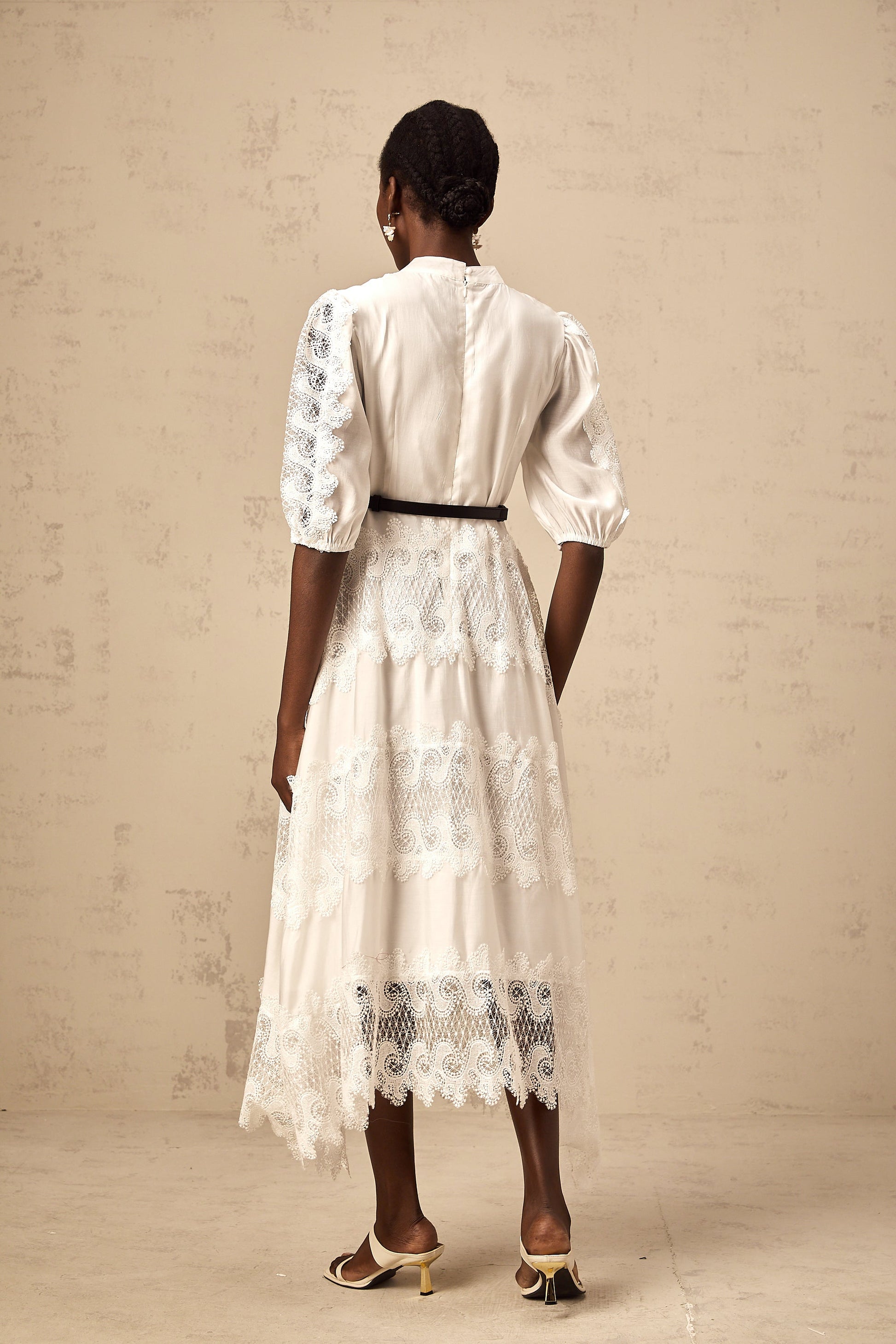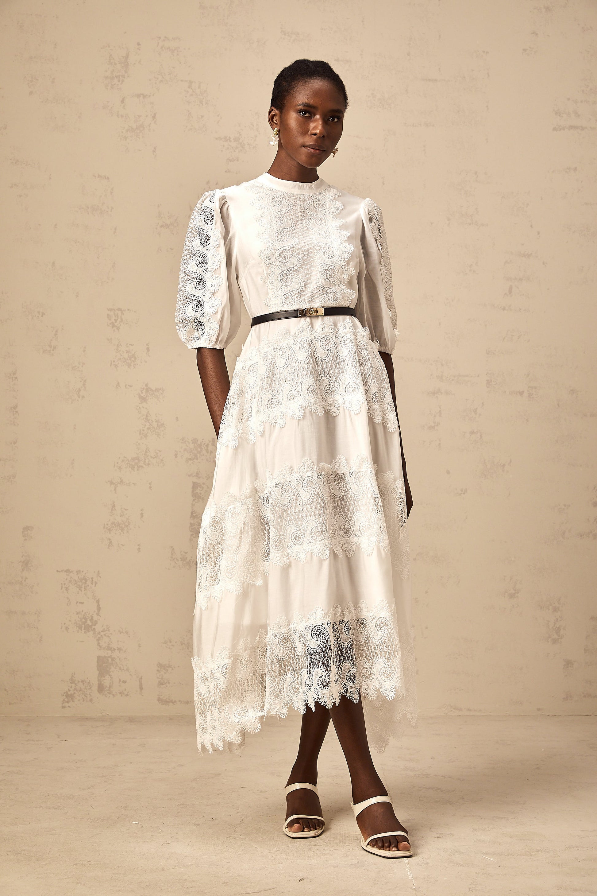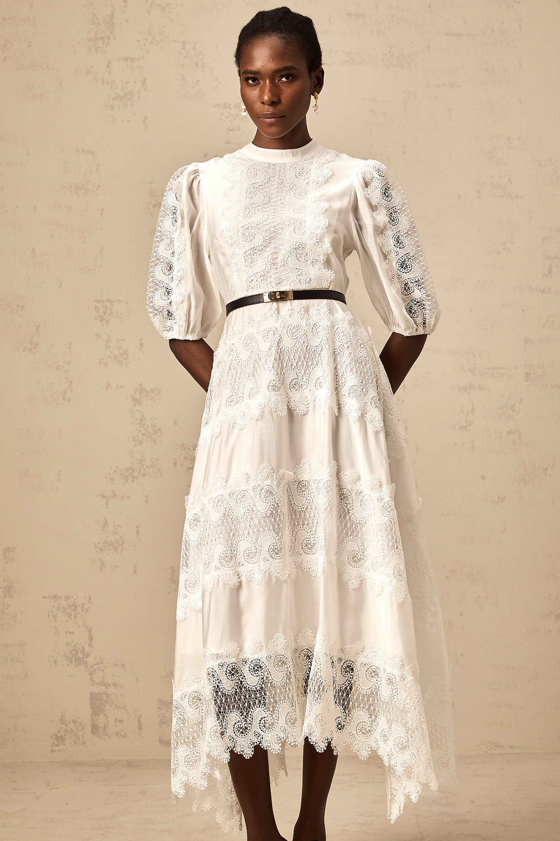 Tamara white belted lace-trim panelled midi dress