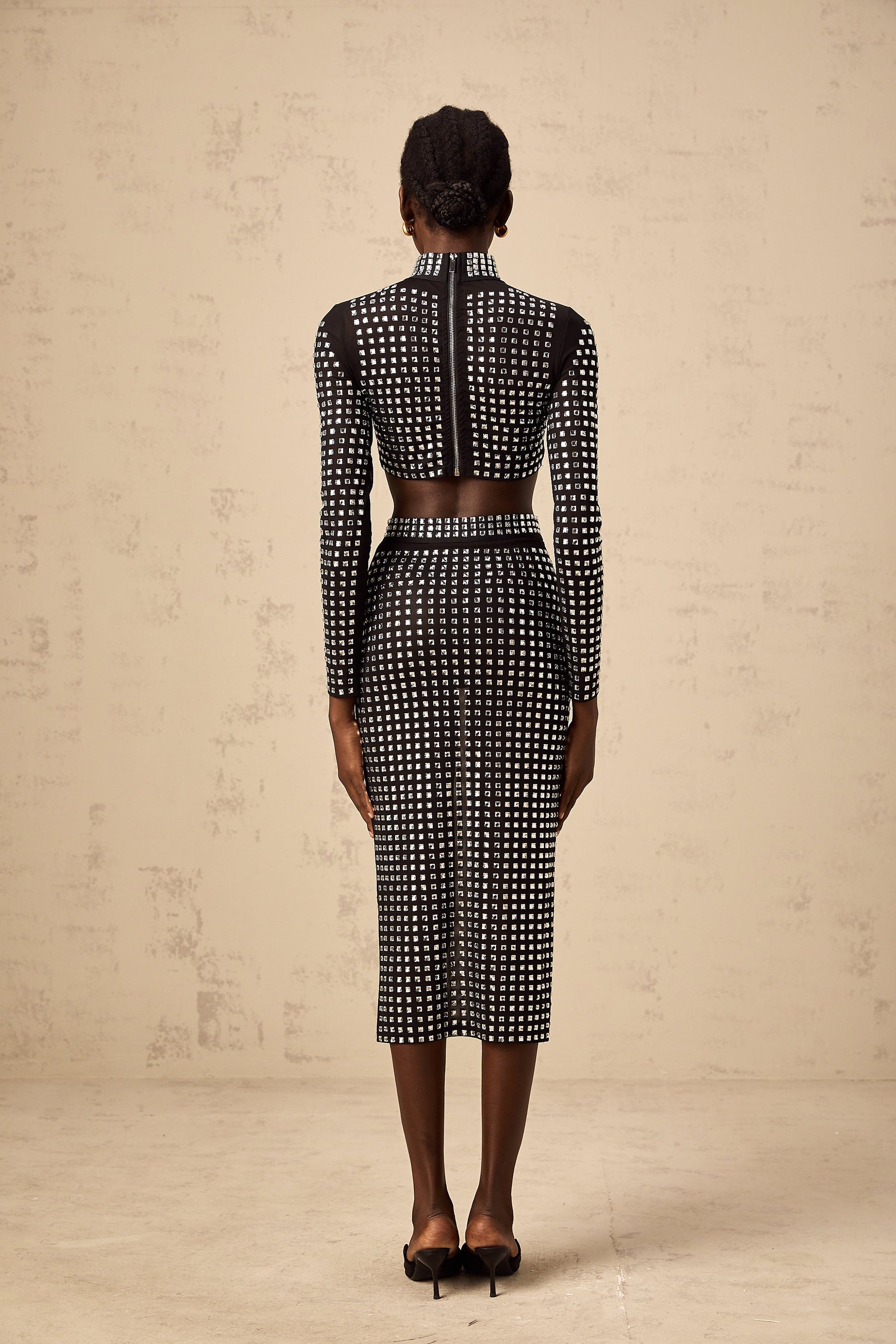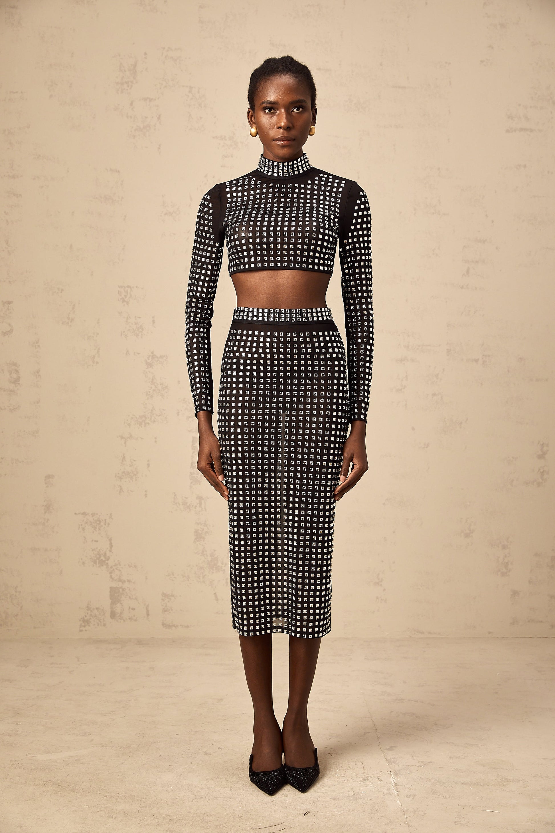 Vera black rhinestone mesh top & skirt matching set