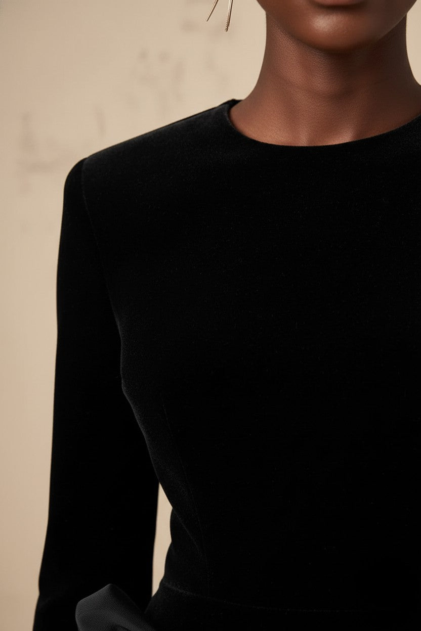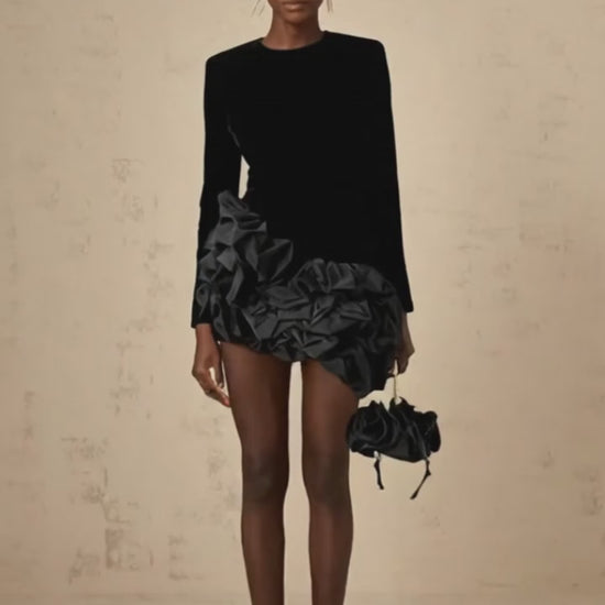 The upper body features a sleek long-sleeve velvet bodice, offering clean lines and a refined, elongated shape. Balancing the minimal top, the skirt blooms dramatically into hand-crafted 3D rosette folds, creating a sculptural effect reminiscent of high-fashion runway pieces.