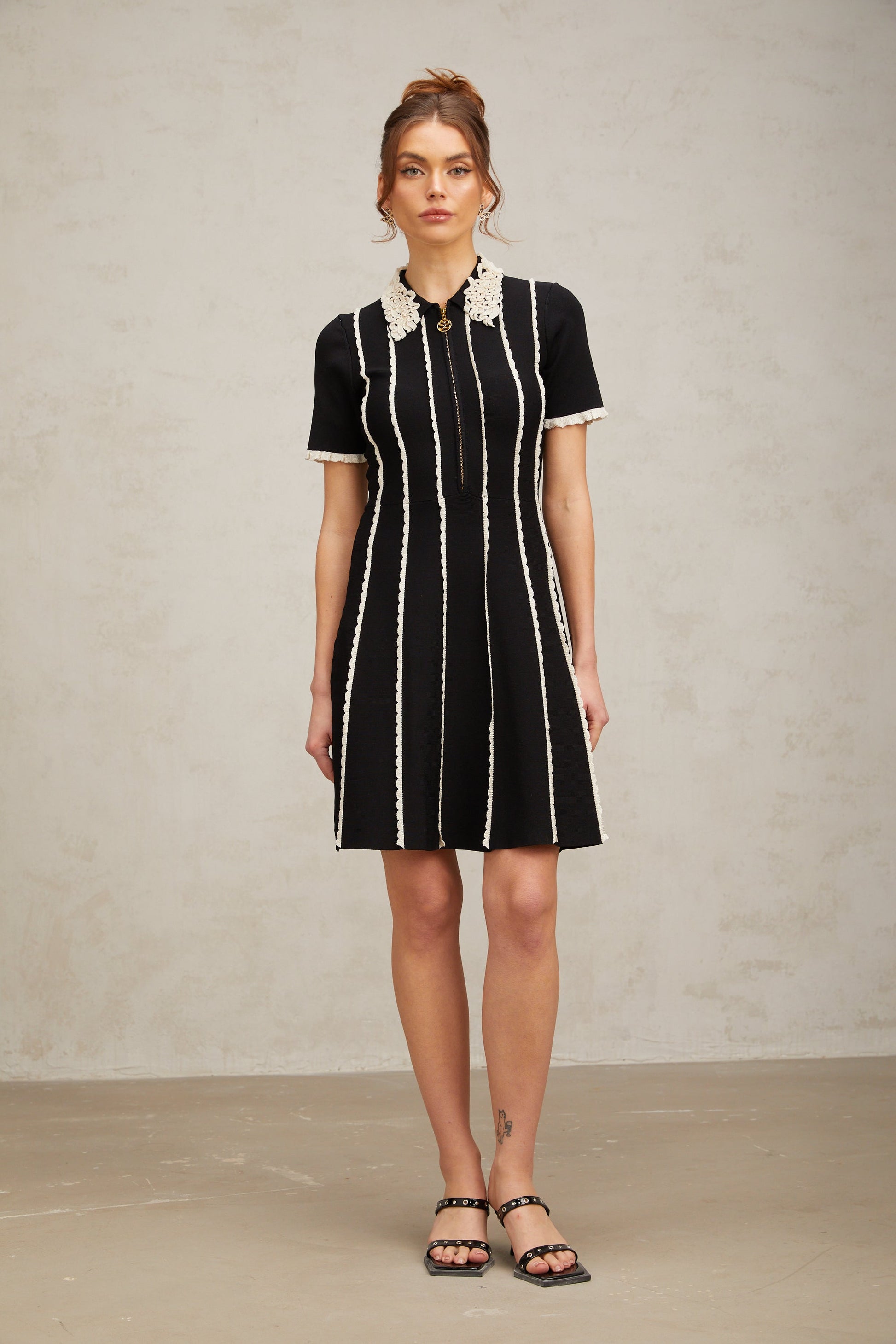 Zazie black vertical-striped ruffle-trim knit mini dress